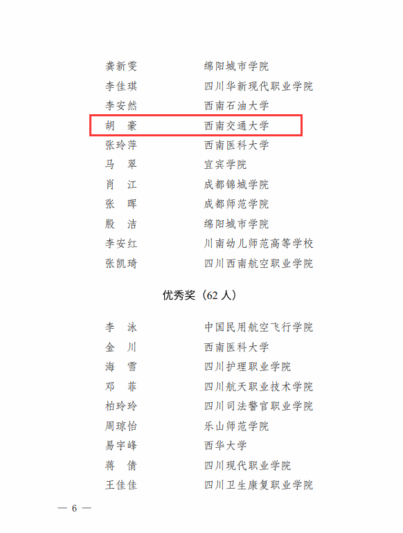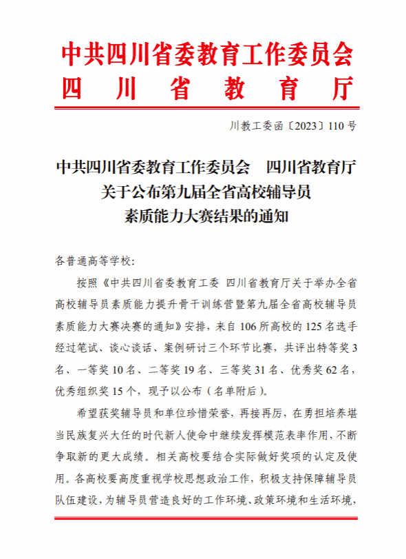 近日,在刚刚结束的四川省高校辅导员素质能力提升骨干训练营暨第九届全省高校辅导员素质能力大赛决赛中,十大信誉官网辅导员胡豪获省三等奖,是继于楠2016年获得相关奖项之后我校又一辅导员获此奖项。