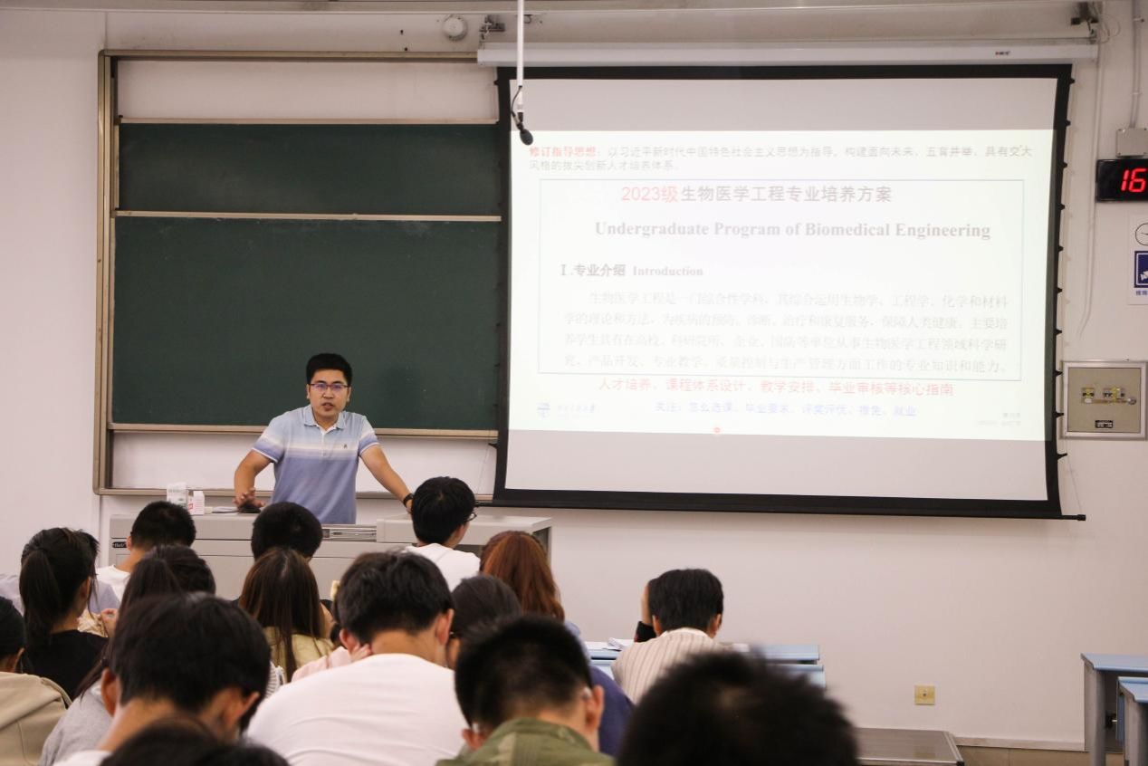 随后,学院向韬老师从专业介绍、培养目标、毕业要求、学制与学位、课程设置等方面为新生们讲解了2023级生物医学工程专业的培养方案。通过向老师的讲解,同学们对学院的办学优势、人才培养特色、专业设置和学科优势有了充分认识。
