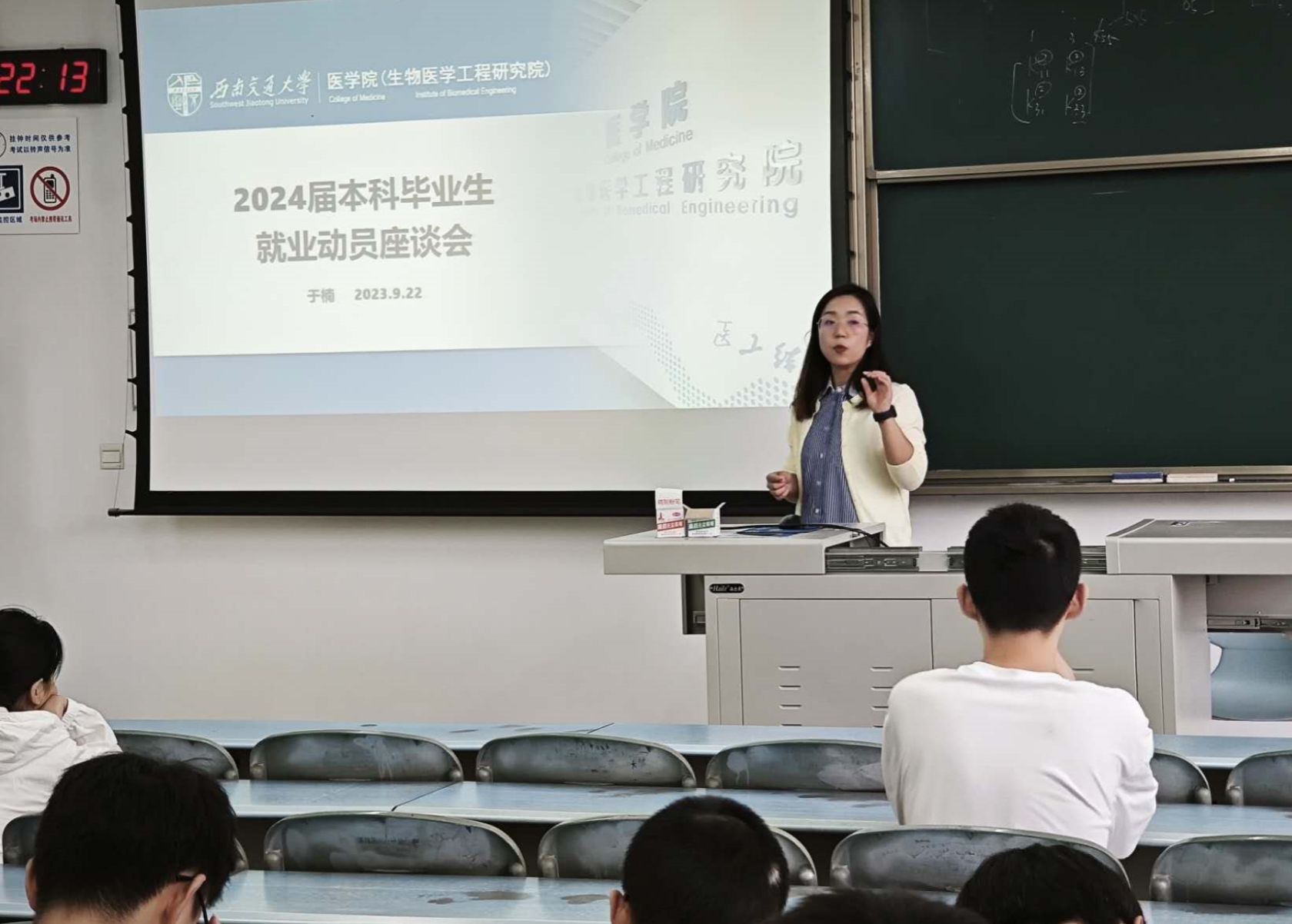 面对即将到来的秋季就业高峰,学院针对当前高校毕业生就业形势,为2024届本研毕业生做了形势分析研判和就业动员。在成都市第三人民医院,学院党委李锦红书记逐一了解2024硕士毕业生论文的进展情况、就业意向,帮助学生打通思想堵点、破解就业迷茫,为学生毕业和就业“出实招”。党委副书记于楠,为2024届本科毕业生讲解经济下行压力下的大学生就业形势,结合生物医学工程专业历年来的升学和就业情况,先后给出“转变观念、认清形势、做好规划、确定目标、付诸行动、承受压力”六个方面的建议。