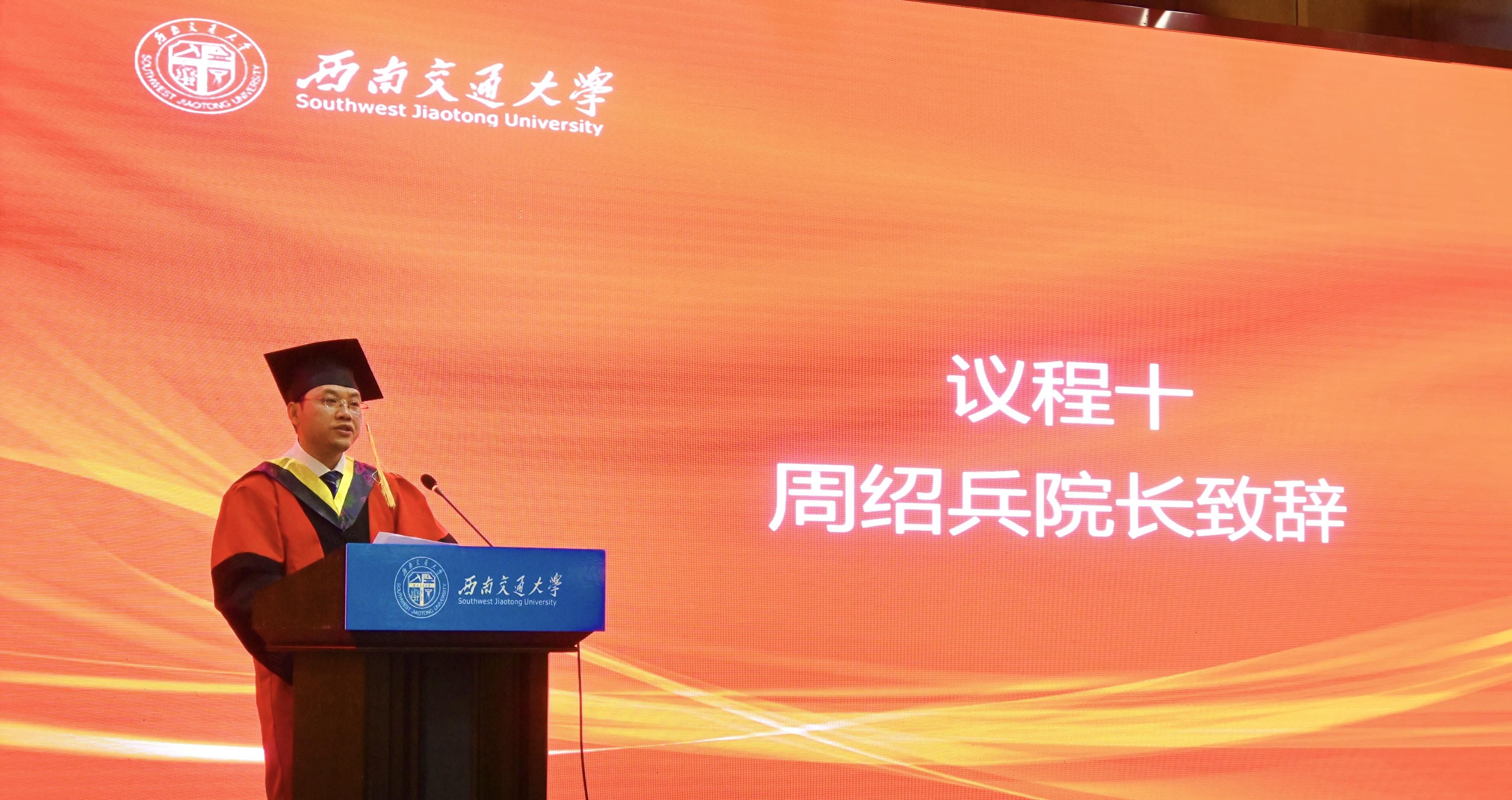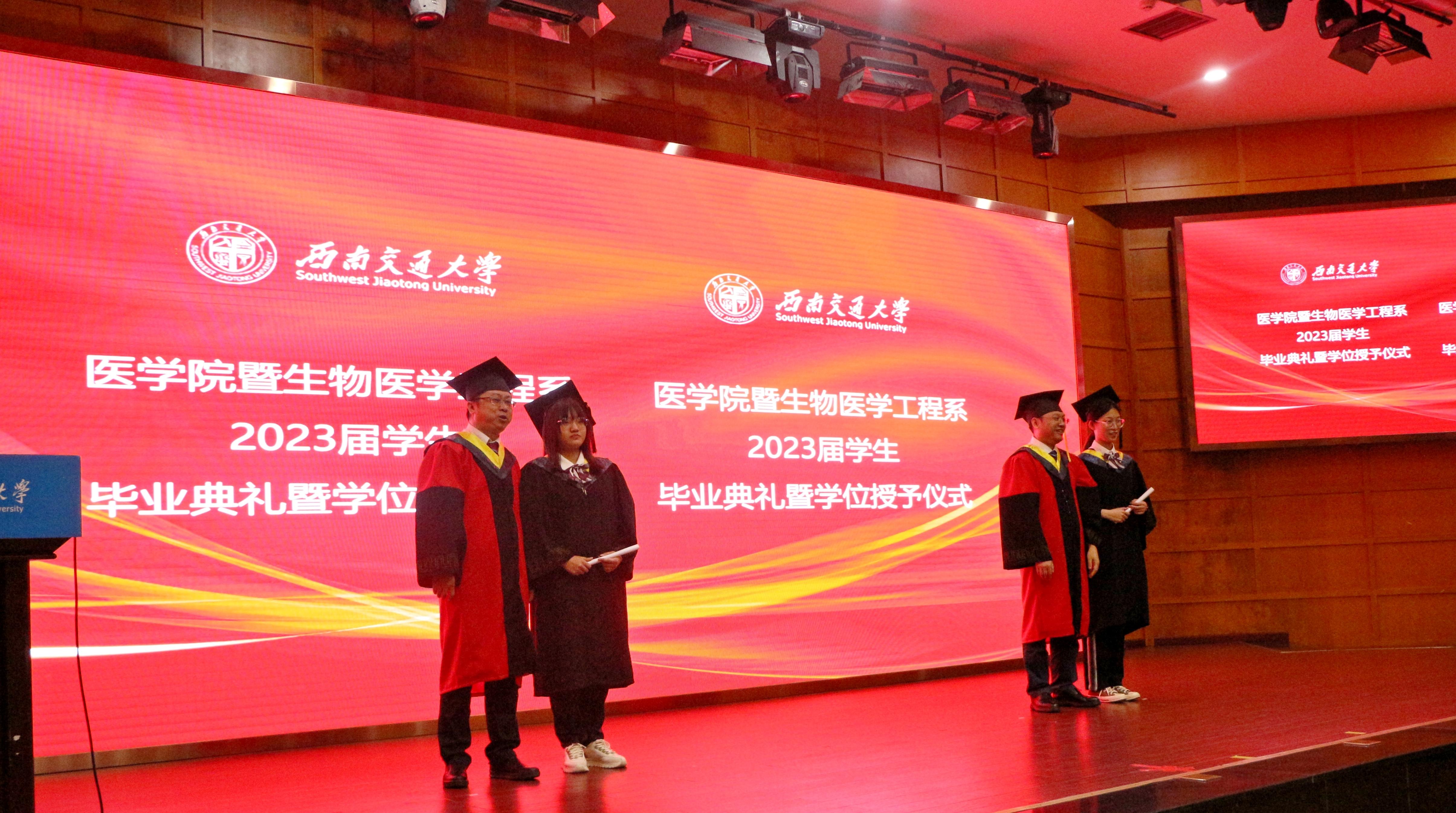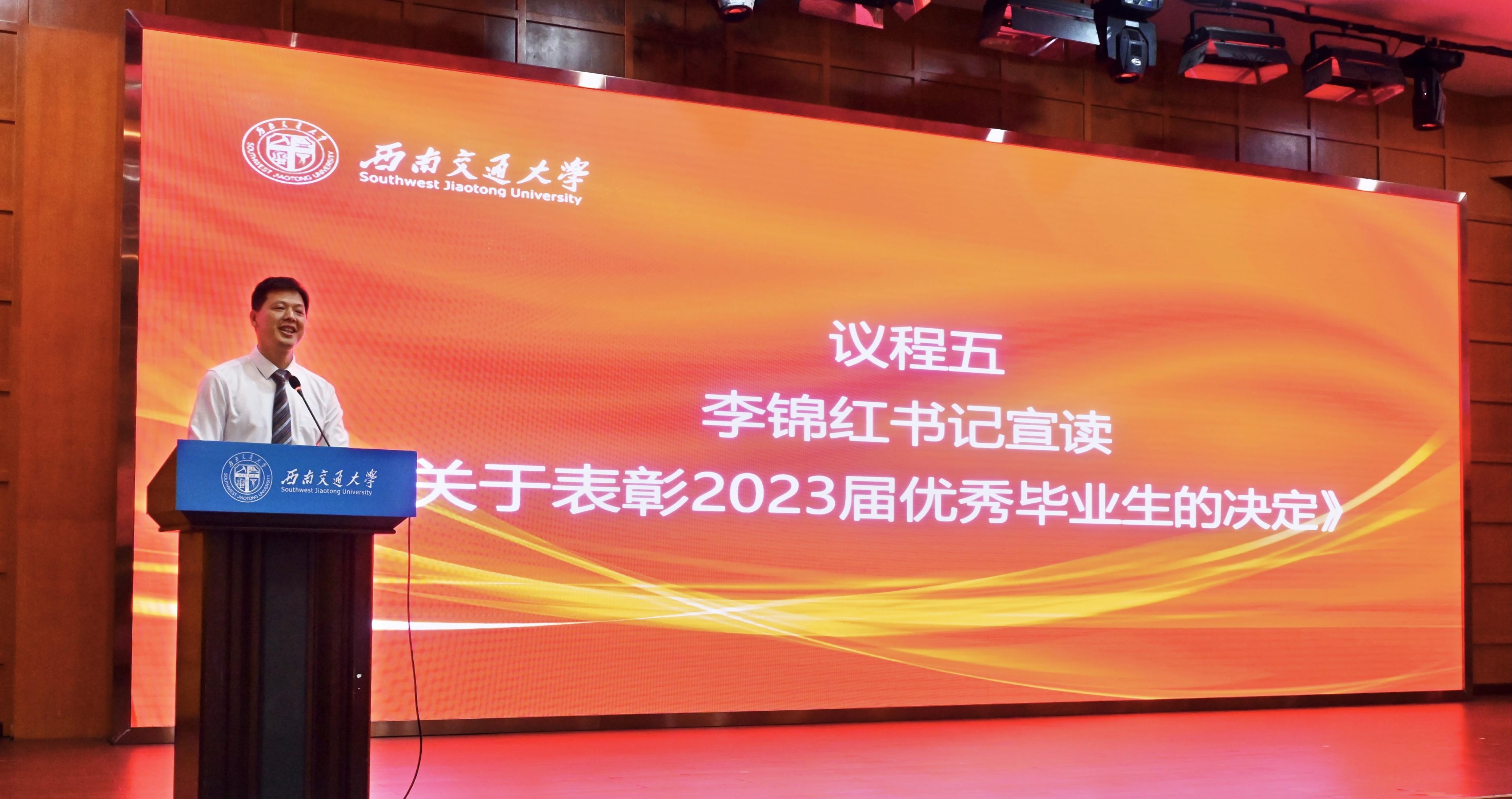 学院党委书记李锦红宣读了《关于表彰2023届省级、校级优秀毕业生的决定》。经校长办公会审定,四川省教育厅批准,决定授予网投十大信誉可靠平台李杨、周孟雪2名本科生,梁琦、武楷文、赵治戎3名研究生,“四川省优秀大学毕业生”荣誉称号。经校长办公会审定,决定授予网投十大信誉可靠平台侯丁煜、梁月、于昕冉、赵一心、姚烨兰5名本科生,罗强、刘瑶、鲁欣、杨雪、喻谦、张婕鑫、张雪7名研究生“网投十大信誉可靠平台优秀毕业生”荣誉称号。李锦红书记向获表彰的毕业生及全体毕业生致以祝贺,希望广大毕业生坚定理想信念,继续秉承和发扬“竢实扬华,自强不息”的交大精神,脚踏实地、埋头苦干,肩负当代大学生的使命担当,续写新时代青年的奋斗征程。随后,周绍兵院长与李锦红书记共同为获得省级、校级优秀毕业生的同学们颁发了证书。