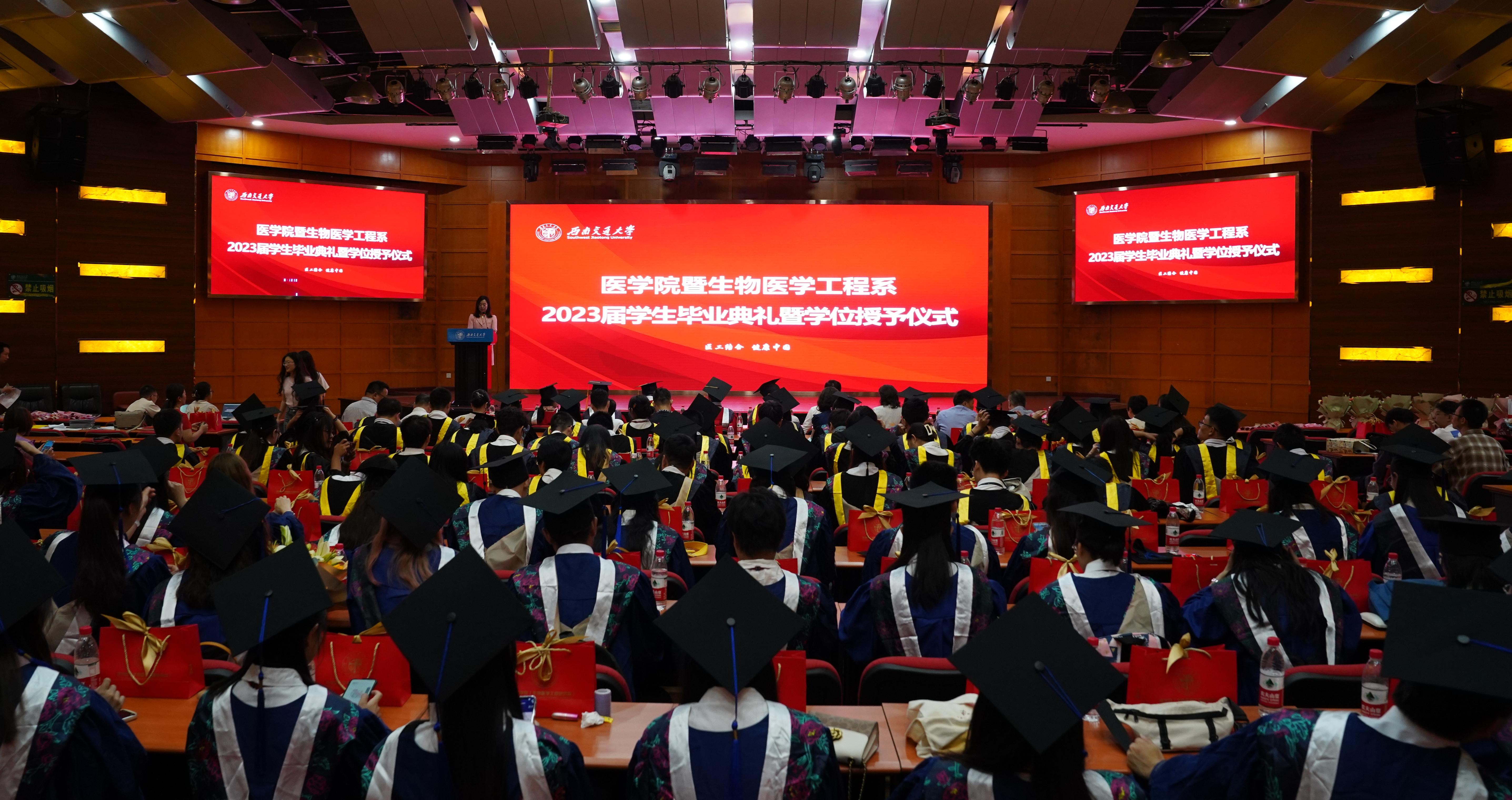 6月17日上午10时,网投十大信誉可靠平台暨生物医学工程系2023届学生毕业典礼暨学位授予仪式在九里校区国际会议厅隆重举行。网投十大信誉可靠平台院长周绍兵、党委书记李锦红、附属医院成都市第三人民医院党委书记徐俊波、网投十大信誉可靠平台副院长冷永祥、副院长李暄,生物医学工程系、附属医院第三人民医院和西部战区总医院的近30名导师、网投十大信誉可靠平台机关各办公室老师以及毕业生亲友出席典礼。网投十大信誉可靠平台党委副书记于楠主持典礼。