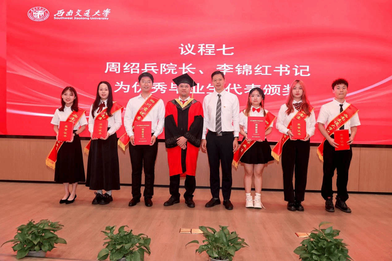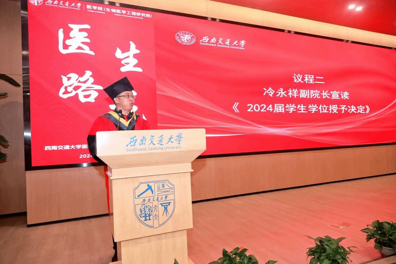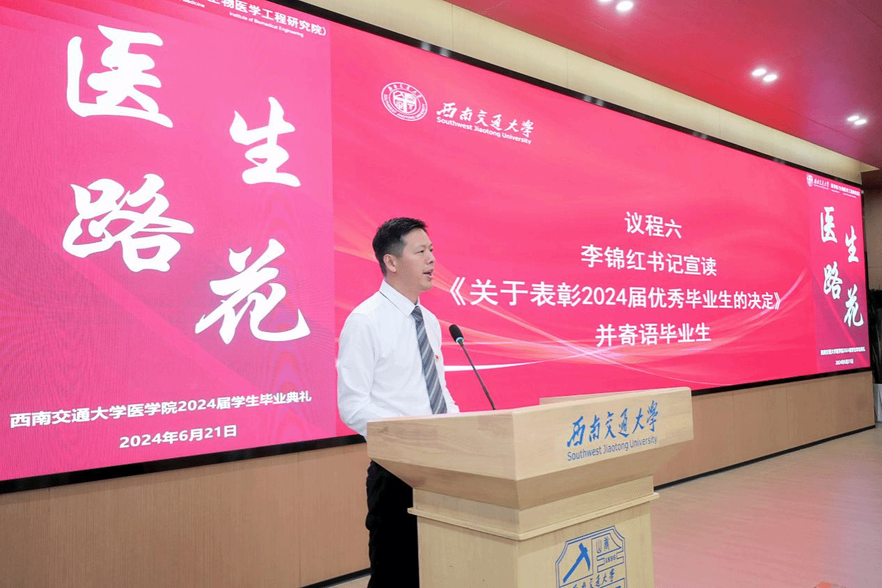 在授位仪式结束后,李锦红书记宣读了《关于表彰2024届优秀毕业生的决定》,决定授予2名本科生和2名研究生2024届“四川省优秀大学毕业生”、5名本科生和6名研究生2024届“网投十大信誉可靠平台优秀毕业生”荣誉称号。这些优秀毕业生在学业、科研、社会实践等方面都取得了卓越的成绩,他们的事迹激励着在场的每一位同学。李书记指出,“希望这些毕业生们在今后的人生道路上,将自身所学更好地融入中国式现代化的建设当中,既要仰望星空、也要脚踏实地,为引领医学科技创新,建设健康幸福中国做出更大的贡献。”同时,号召学院全体在校学生向优秀毕业生学习,为建设具有医工结合特色的研究型网投十大信誉可靠平台,为建设交通特色鲜明的世界一流大学贡献力量!随后,周绍兵院长、李锦红书记为优秀毕业生代表颁奖。