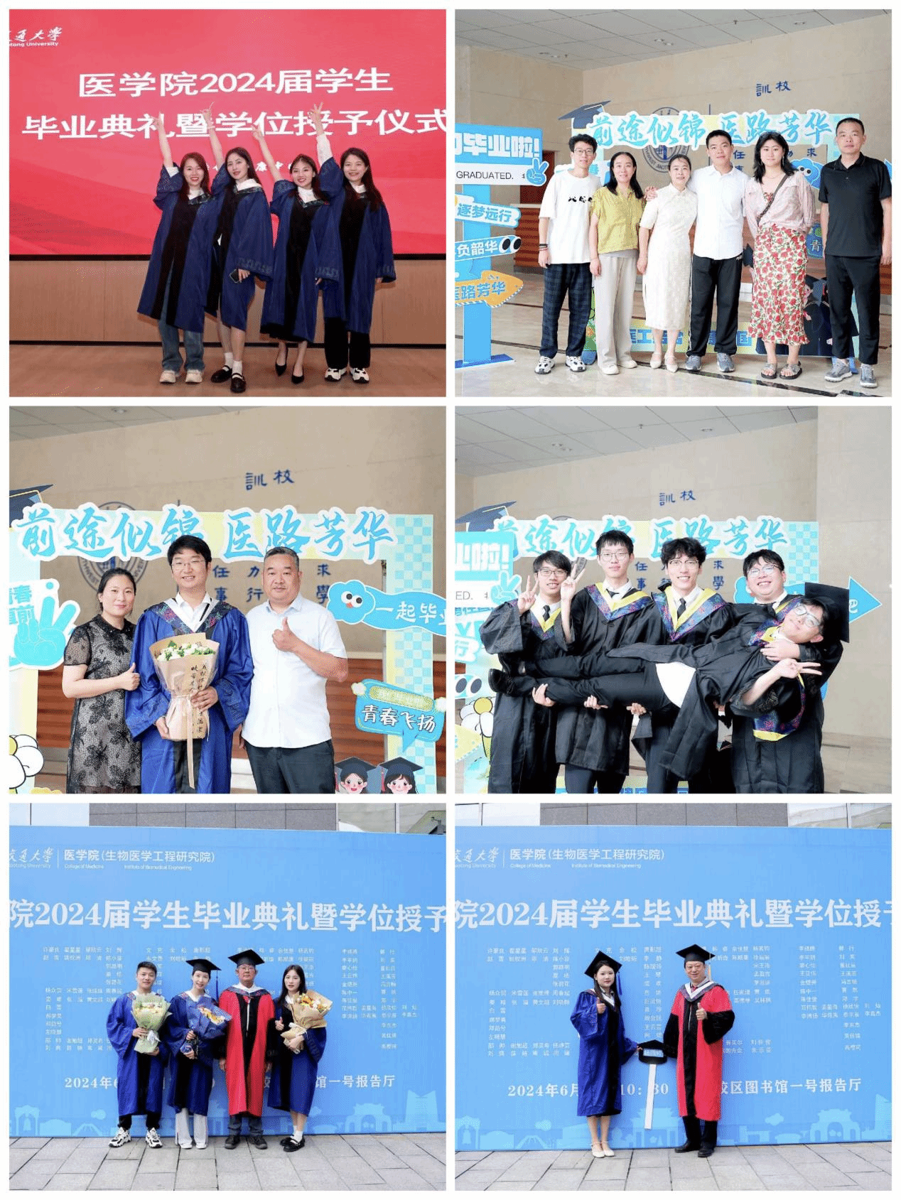 在活动的最后,毕业生们身着整齐的学位服,手捧鲜花,脸上洋溢着既激动又感慨的神情,缓缓走向学院精心准备的毕业墙,与自己的家人、朋友、导师留影。墙上写着每个毕业生的名字,摄影师快门声此起彼伏,捕捉着每一个动人的瞬间。每一张照片都记录着毕业生们的青春岁月,承载着他们对未来的憧憬和期待。在这温馨的氛围中,毕业生们留下了他们在学院最后的足迹,也留下了他们最美好的回忆。在这里,他们告别了青涩的校园时光,迈向了崭新的人生旅程。