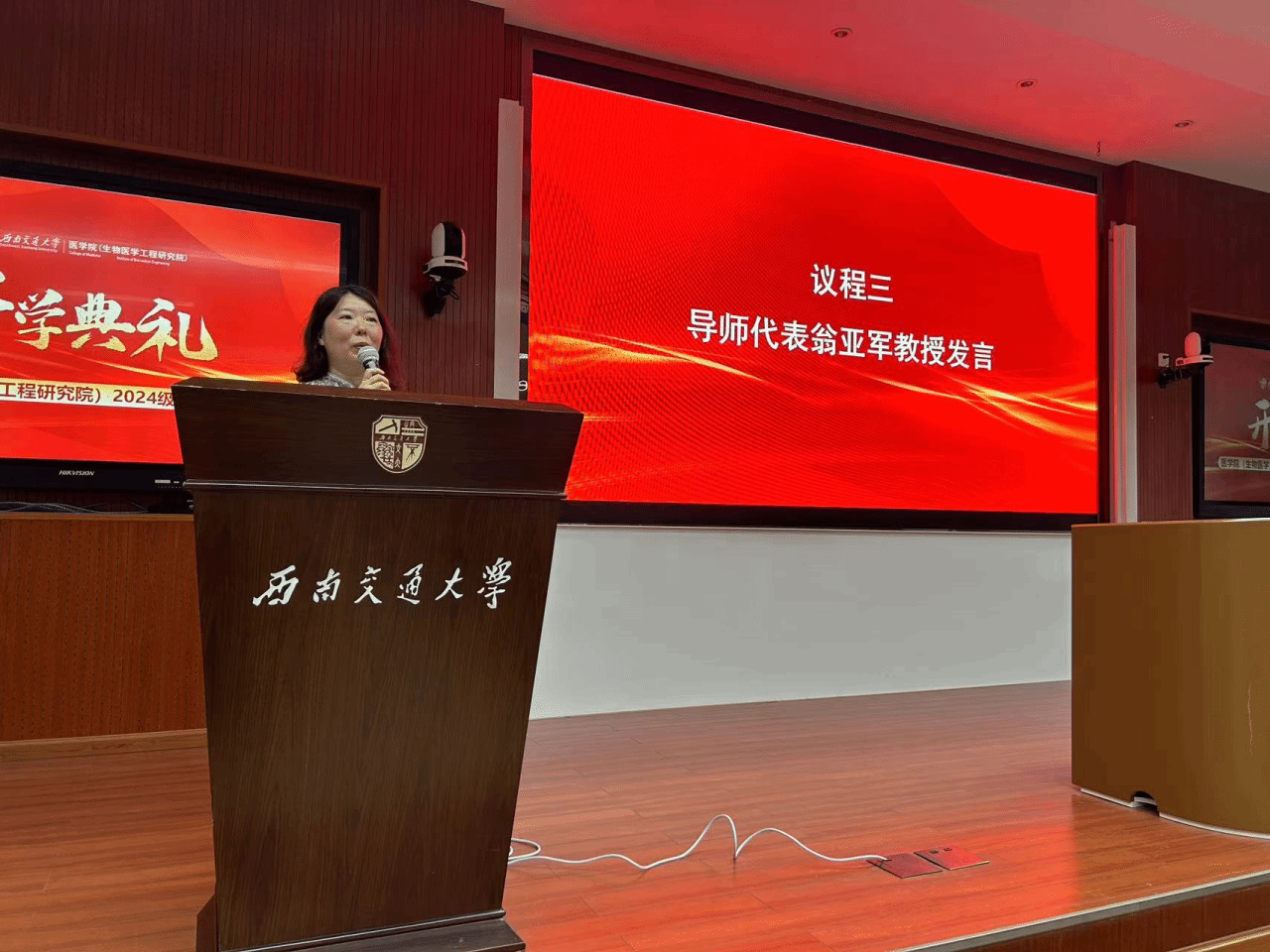 紧接着,导师代表翁亚军教授上台发言。翁教授以其丰富的教学经验和深厚的学术造诣,向新生们传授了宝贵的学术经验和人生智慧。她的话语中充满了对新生们的殷切期望,希望他们能够珍惜时光,勤奋学习,早日成为栋梁之才。