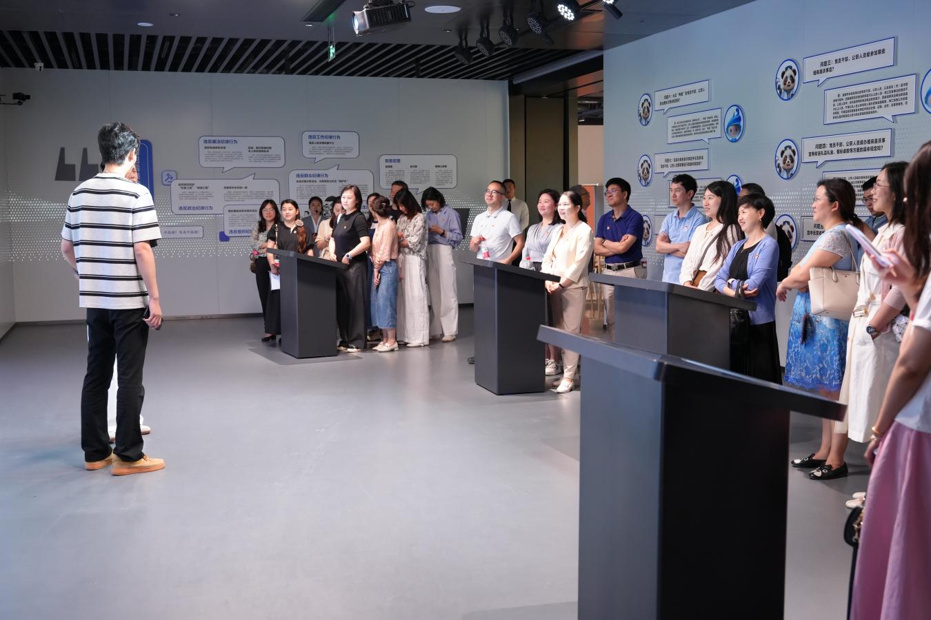 在场馆讲解员的带领下,全体人员按照“溯源流、明方向、立规矩、普规纪、答疑惑、强免疫”六个篇章,通过“看、听、游戏”等创新形式,开展了一场数字化、沉浸式的党纪法规学习教育。