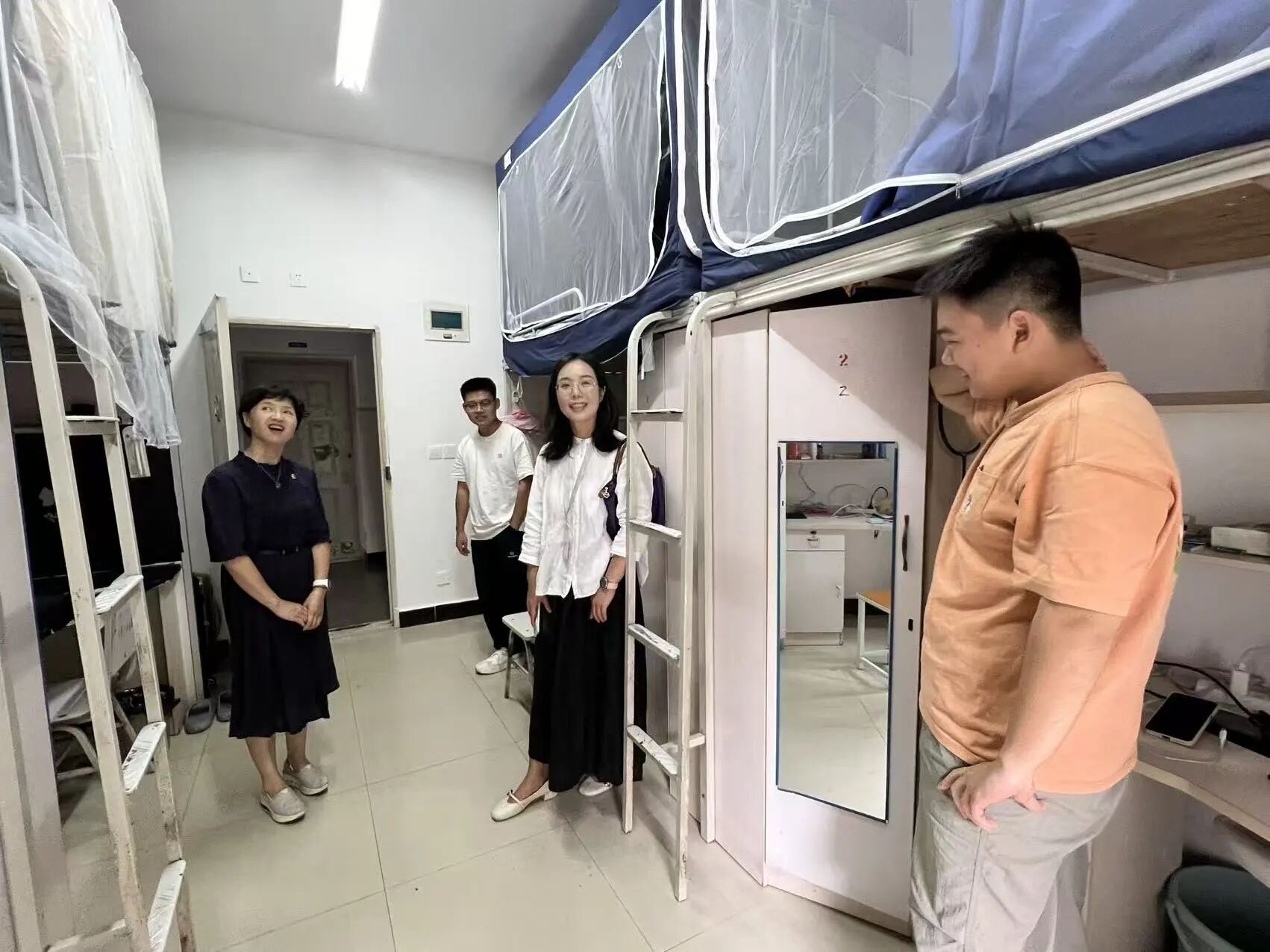 党委书记曾东红、党委副书记于楠及2025级新生辅导员靳涵,深入学生宿舍看望新生,关切询问同学们的生活适应情况,勉励大家营造良好生活环境,培养独立能力,建立融洽关系,祝愿新生在交大安居乐业,开启人生新篇。