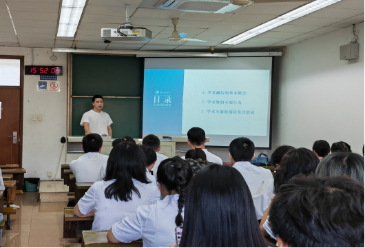 学术诚信主题分享会伊始,姚权州同学首先以学术诚信的基本概念及主要内容为切入点,让同学们对于学术诚信和学术道德有了基础的认识;随后,向大家准确解释学术不端行为,并通过生动形象的视频对七种学术不端行为、学术不端的预防以及惩戒做了细致全面的讲解。最后,引用“天津高校硕士论文抄袭”、“天大厦大两硕士论文雷同“等由于学术诚信缺失而造成严重后果的案例,警戒同学们在今后的学术生涯中务必要遵守学术规范,自觉抵制学术造假行为。