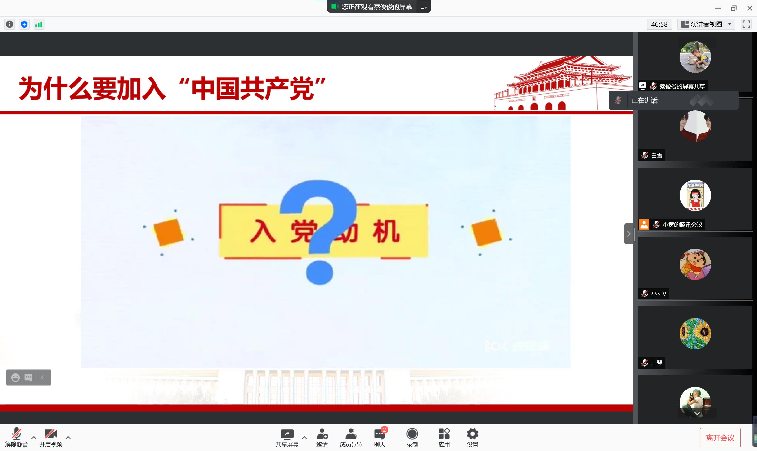 讲座中,蔡老师首先利用生动形象的视频短片带领同学们回顾了中国共产党的成立及其发展历程,让同学们深刻了解了中国共产党带领全国各族人民迎来从“站起来“、”富起来”到“强起来”伟大飞跃的百年奋斗史。