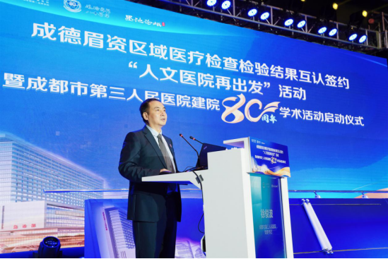 附属医院(成都市第三人民医院)党委书记徐俊波代表三医院致辞。徐俊波回顾了三医院的办院历史,80年风雨兼程,走过光辉历程,已成长为集医疗、科研、教学、预防、保健和康复为一体的国家三级甲等综合性医院,也是四川省九大区域医疗中心之一。徐俊波表示,在建院80周年之际,在成德眉资地区发起“人文医院再出发”活动,是继承“中国现代内科医学奠基人”戚寿南、“中国公共卫生学之父”陈志潜、“中国神经病理学鼻祖”黄克维三位老院长的精神,秉承“大医精诚、厚德积善”的院训,坚持以“人民群众满意”为目标,致力于“办一家有温度的医院、做一个有温度的医者”,以“人文医院建设”为抓手,将人文医学端于心、人文情怀始于行,全力打造患者满意、职工幸福的温度医院。倡导尊重生命价值、竭尽医者责任、提高沟通能力等,通过不断优化服务链条、完善服务流程和细节,提供全人、全程、全生命周期的医学人文关怀服务,满足人民群众多层次、多样化的医疗服务需求。