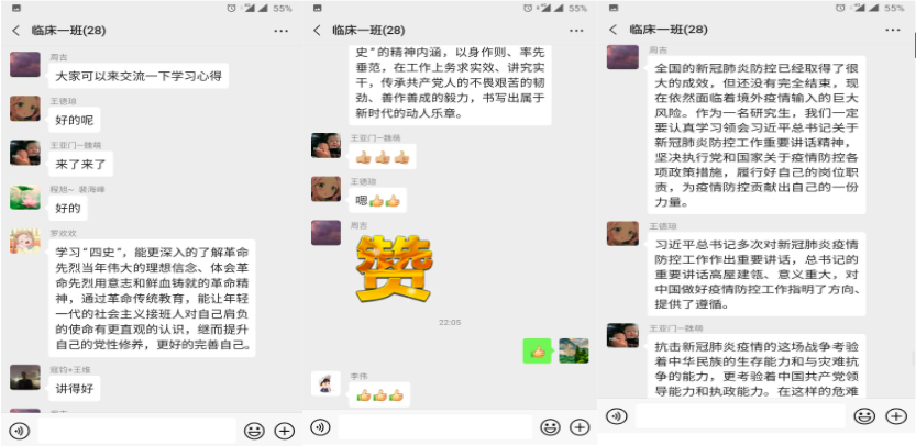 同学们在组织的线上交流学习中积极响应,踊跃发言,其中,罗欢欢同学发言:学习“四史”,能更深入的了解革命先烈当年伟大的理想信念、体会革命先烈用意志和鲜血铸就的革命精神,通过革命传统教育,能让年轻一代的社会主义接班人对自己肩负的使命有更直观的认识,继而提升自己的党性修养,更好的完善自己。