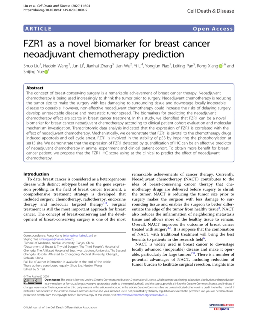 近日,网投十大信誉可靠平台附属医院(成都市第三人民医院)乳腺甲状腺外科副主任医师王浩斌博士课题组与南开大学网投十大信誉可靠平台副教授岳世静博士课题组在Nature出版集团旗下细胞生物学权威期刊《Cell Death & Disease》(影响因子:6.304,JCR2区)在线发表题为《FZR1 as a novel biomarker for breast cancer neoadjuvant chemotherapy prediction》的合作研究论文,在寻找乳腺癌新辅助化疗疗效预测指标上取得重要进展。