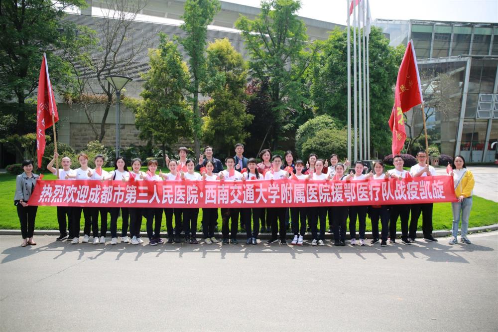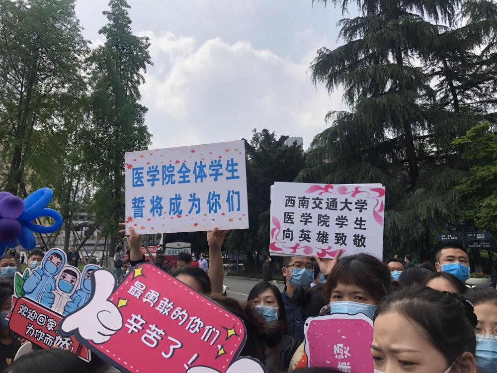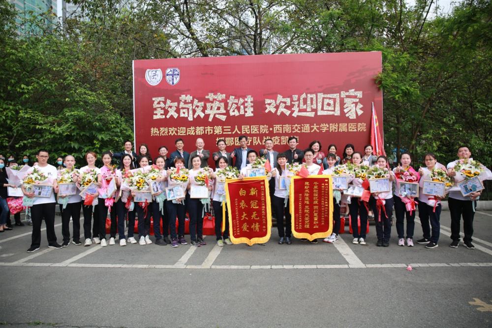 2月2日,网投十大信誉可靠平台附属医院(成都市第三人民医院)支援湖北医疗队赶赴武汉。59天时间里,他们持续战斗在重症患者治疗的火线,先后接诊百余位重症及危重症患者,创造出一个又一个生命奇迹。4月14日,他们正式解除为期14天的休养和医学隔离观察,胜利凯旋,和已经70多天没见的家人、同事团聚。网投十大信誉可靠平台党委副书记桂富强、网投十大信誉可靠平台直属党支部书记李锦红、部分师生代表前往现场迎接英雄的归来。