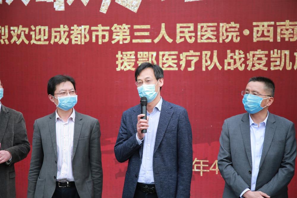 桂富强代表学校向医疗队全体队员致以最崇高的敬意,他说,今天你们平安归来,我们非常激动和感慨。学校在第一时间将你们动人的抗疫故事和壮举告诉了几十万交大人,因为你们,交大人没有缺席这场习近平总书记亲自部署、亲自指挥的伟大斗争,我们取得了阶段性胜利。因为你们,山河无恙!全体交大人为你们骄傲和自豪!网投十大信誉可靠平台附属医院(成都市第三人民医院)党委副书记、院长刘早阳代表医院党政班子及全院职工,点赞全队战疫英雄平安凯旋:“敬爱的英雄,亲爱的同事——欢迎回家!”