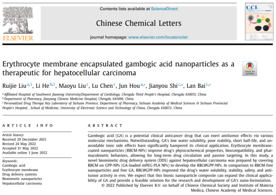 近日,网投十大信誉可靠平台研究生导师侯君团队在中国化学会主办、中国医学科学院药物研究所承办的中科院Q1区SCI刊物Chinese Chemical Letters(IF:8.455)发表题为“Erythrocyte membrane encapsulated gambogic acid nanoparticles as a therapeutic for hepatocellular carcinoma”的研究。