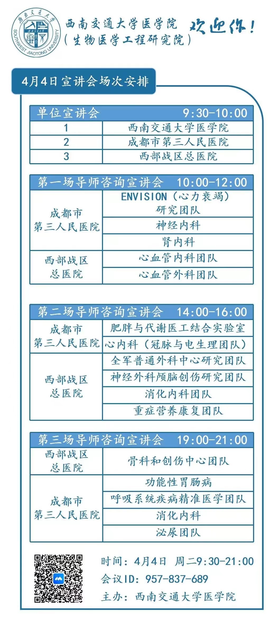 考生可按照学院导师及团队线上咨询会的时间安排,结合自身需求进入相应咨询会场次(登录腾讯会议APP,扫描二维码或输入会议ID957-837-689) ,与学院导师及团队进行咨询交流。