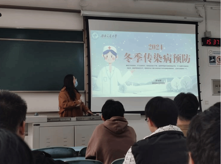 在冬季预防传染病方面,靳涵老师首先介绍了冬季常见的传染病,如流感、感冒、肺炎等,并强调了个人卫生习惯的重要性。入冬以来,全国多地进入呼吸道疾病高发期,并且呈现多种病原体共同或交替流行态势。她提醒同学们,尤其是2020级考研的学生,一定要做好自身的防护,平时适当锻炼,增强体质,以饱满的精神状态和健康的身体素质迎接考研。2021级最近许多同学都出现了流感请假的状况,已经生病的同学要注意休息,及时治疗;未生病的同学要做好自身防护,勤加锻炼。针对低年级同学,王川玲老师强调宿舍卫生的重要性,要重视每月一次的“生医大扫除”,宿舍平时也要保持通风,勤打扫。她建议同学们可以采取多种防范措施,如锻炼身体、戴好口罩等降低感染风险,保障身体健康。如果出现发热、咳嗽等症状,应主动就医并告知医生近期接触过的人群,保障自身及他人安全。