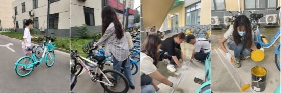 一张设计图纸,彰显灵巧;一次测量,追求精准;一卷胶带,突出细致;一抹油漆,展现责任……学生自发组成了两组志愿者团队,从单车搬迁到场地清扫,从卷尺测量到油漆粉刷,学生们全程参与,事事求细,充分发挥了他们的团队协作能力和创造力。在完成了划线工作的同时,主动承担起维护现场秩序、提醒师生安全行驶等任务。