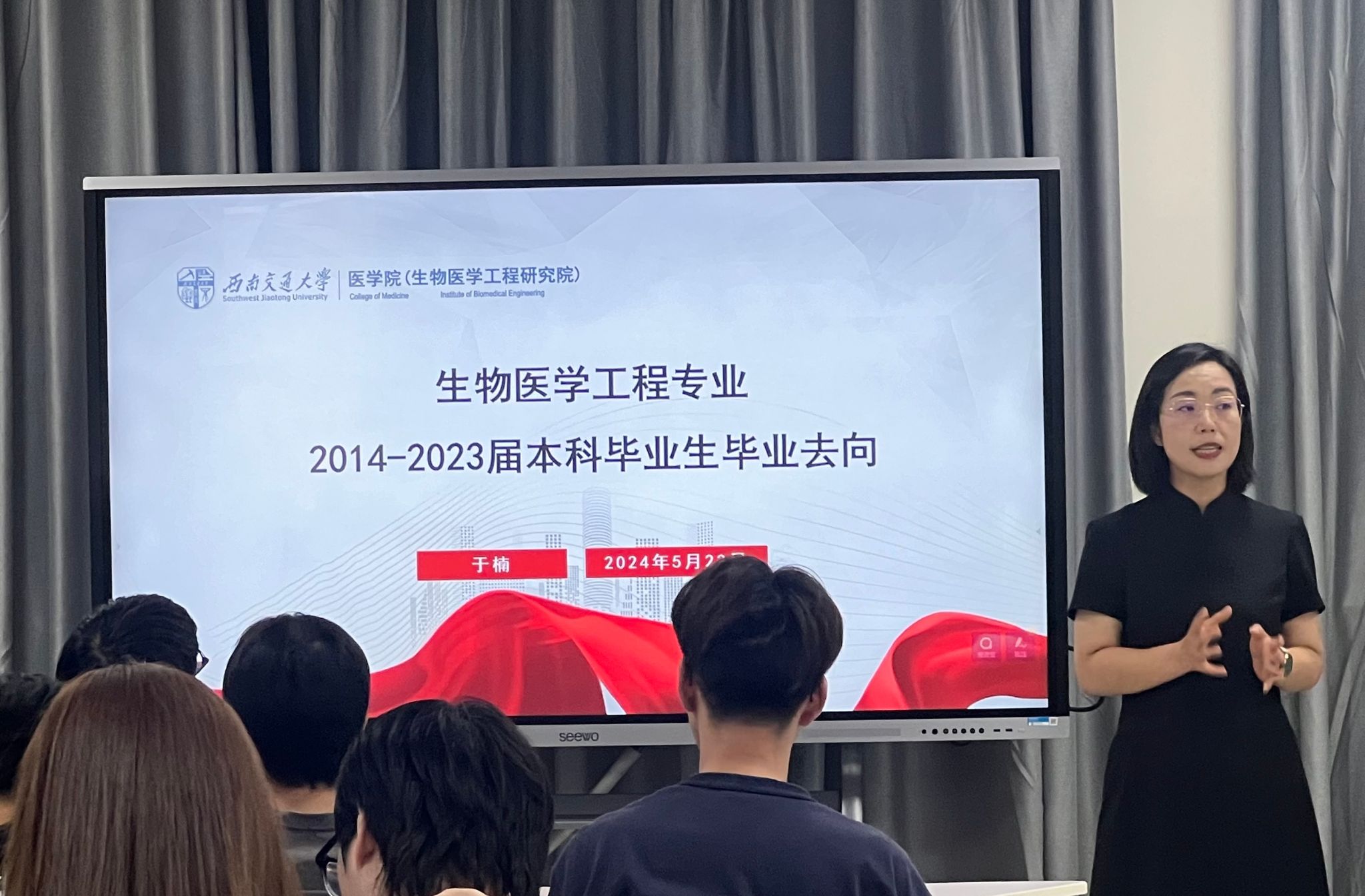 为帮助2025届同学对生物医学工程专业的毕业去向有更深入的了解,网投十大信誉可靠平台党委副书记于楠为同学们带来了生物医学工程专业近十年来的升学与就业情况分析。她通过详实的数据和案例,展示了生物医学工程专业毕业生在升学深造和就业市场上的优势和竞争力。于楠副书记还就当前就业市场的趋势和用人单位的需求进行了讲解,为同学们提供了宝贵的就业建议。