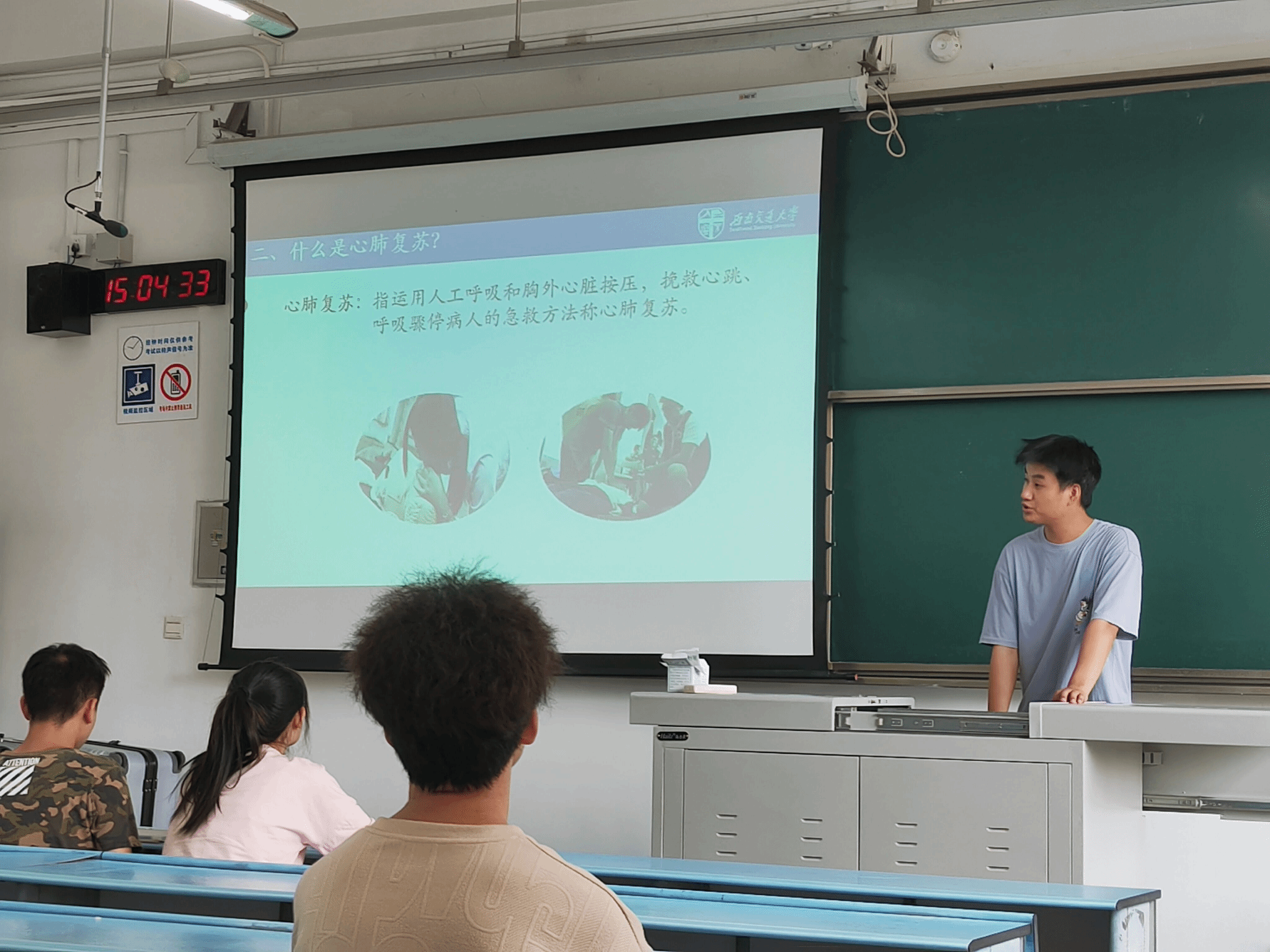 活动伊始,王森林、李林峰为学员们讲解了心肺复苏的重要性和操作要点等理论知识,并强调在心脏骤停等紧急情况下,正确的心肺复苏操作能够极大地提高患者的生存率。随后,张紫鑫、李林峰通过视频演示和现场示范的方式,向学员们展示了心肺复苏的标准操作流程,包括判断意识、呼叫求助、摆放体位、胸外按压和人工呼吸等关键步骤。最后,罗丹详细讲解了海姆利克法的适用情况和操作步骤,并邀请了学员们上台进行模拟操作。
