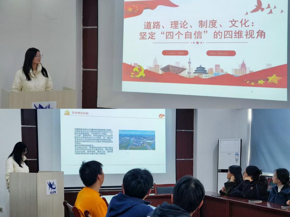 2024年12月6日,领学人李婧玥同学以独特的视角,从道路、理论、制度、文化四个维度出发,深入浅出地解读了“四个自信”的内涵与意义。她指出,“中国特色社会主义道路”是实现中华民族伟大复兴的必由之路;“中国特色社会主义理论体系”为我们提供了行动指南;“中国特色社会主义制度”确保了国家治理体系和治理能力现代化的方向正确;而“社会主义先进文化”则是凝聚民族力量的精神纽带。通过讲解, 同学们 更加深刻地认识到坚持和发展中国特色社会主义的重要性,增强了对党和国家未来发展的信心。