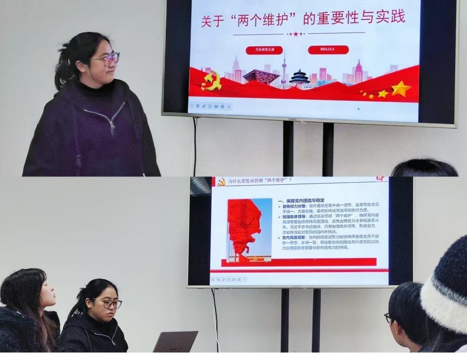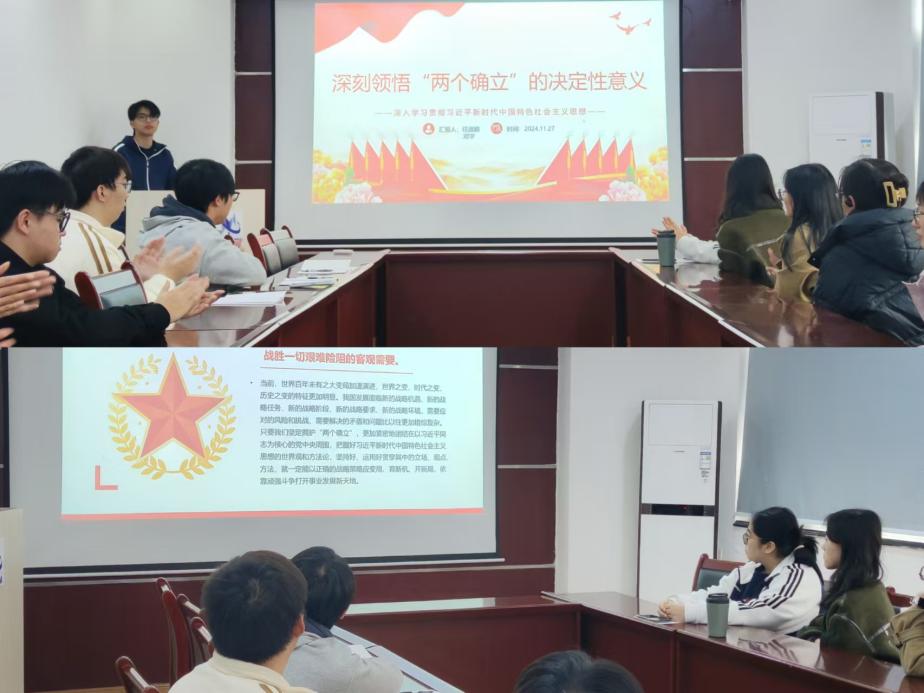 11月的另一次学习会上,任淑颖和邓宇两位同学带领研究生会全体成员共同领学了“两个确立”的重大现实意义和深远历史影响。“两个确立”指的是确立习近平同志党中央的核心、全党的核心地位,以及确立习近平新时代中国特色社会主义思想的指导地位,是中国共产党在新的历史条件下作出的重大战略决策,对于维护党中央权威和集中统一领导,推动党和国家事业取得历史性成就、发生历史性变革具有根本性的保障作用。同时,这也激励着每一位党员和青年学生紧密团结在以习近平同志为核心的党中央周围,坚定不移听党话、跟党走,努力成为堪当民族复兴重任的时代新人。
