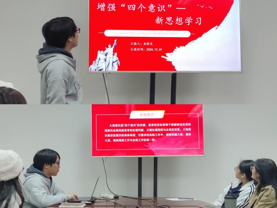 2024年11月27日,在网投十大信誉可靠平台A座215会议室,领学人金煜尧同学围绕“四个意识”,即政治意识、大局意识、核心意识和看齐意识向同学们做了深入讲解。他谈到,在复杂多变的国际国内环境中,作为新时代的青年学子,必须不断提高自身的政治敏锐性和鉴别力,始终做到心中有党、心中有民、心中有责、心中有戒。此外他还结合实际案例,生动形象地阐释了如何在日常学习生活中践行“四个意识”,树立正确的世界观、人生观、价值观,为个人成长和社会进步贡献智慧和力量。