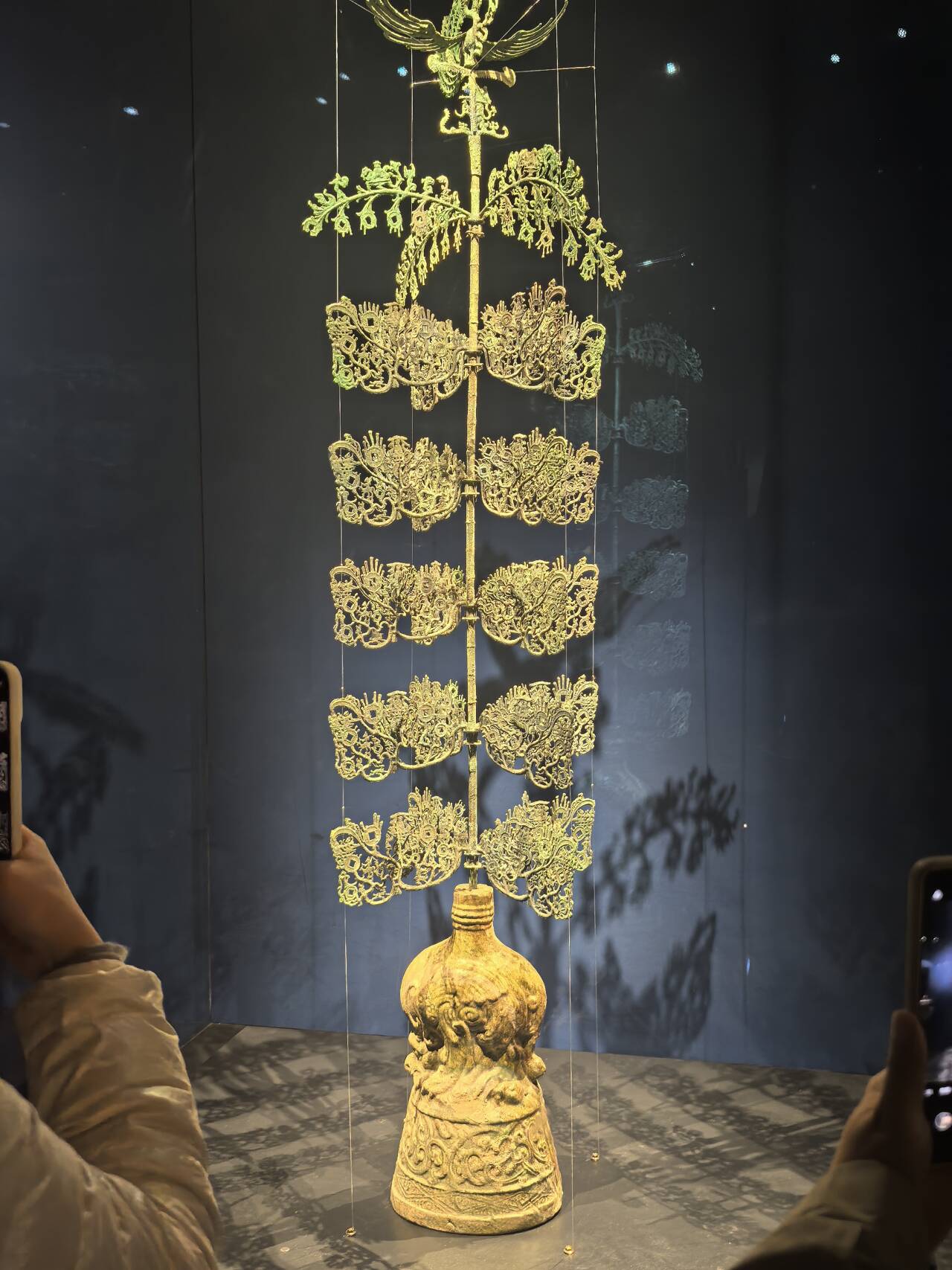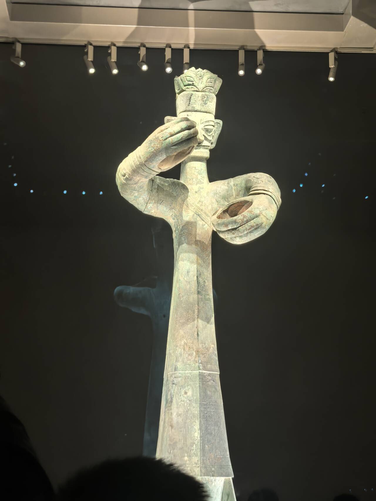 在博物馆的各个展馆内,队员们分散开来,沉浸于对⼀件件精美文物的观赏之中。青铜大立人像庄严肃穆,其高大的身形和独特的造型,仿佛在诉说着古蜀时期的神秘祭祀场景;青铜面具造型夸张,那巨大的眼睛和宽阔的嘴巴,让人不禁对古蜀先民丰富的想象力和卓越的青铜铸造工艺赞叹不已。还有那精美的玉器、陶器等,每一件文物都犹如一本无言的史书,记录着古蜀文明的发展脉络。