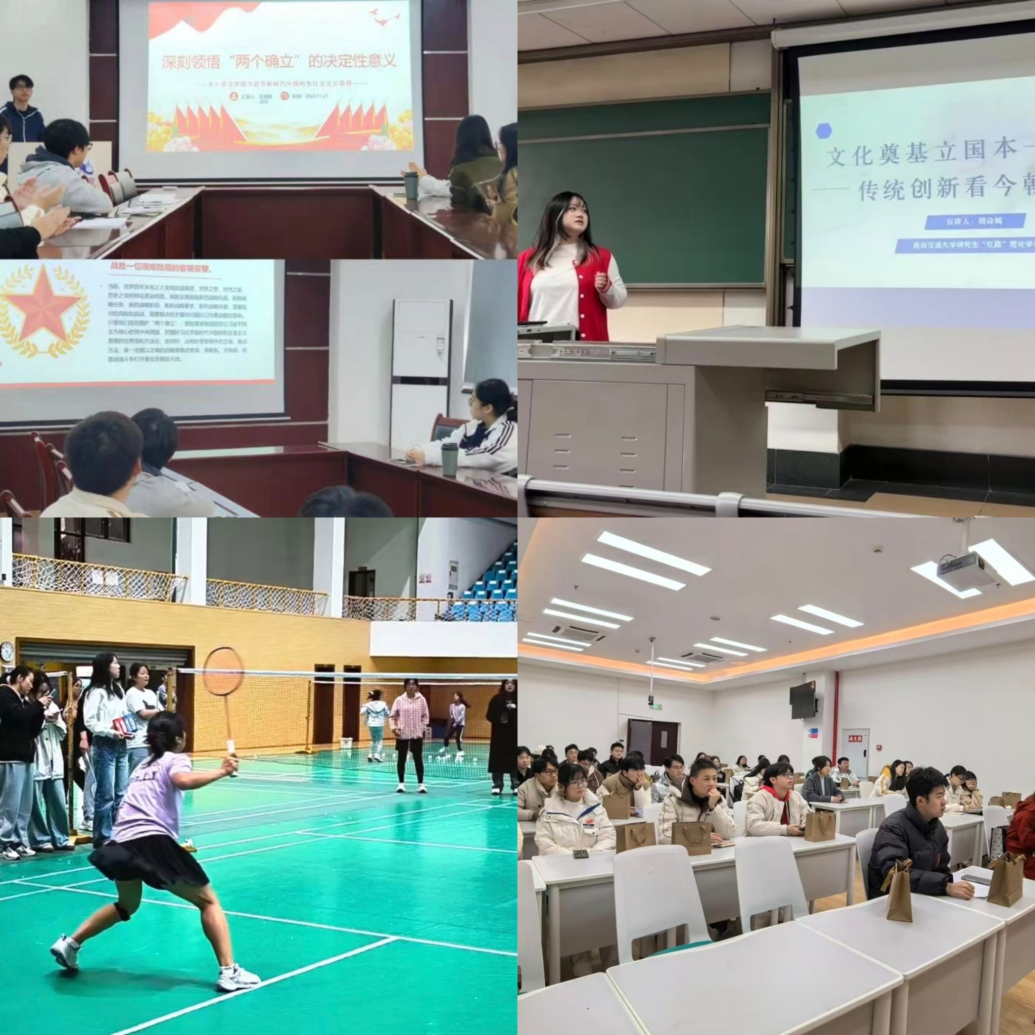 弘扬红色文化,红色宣讲活动激发医学生爱国热情;守护研途安全,防诈讲座普及诈骗防范知识;提升学术素养,培养文件解读讲座助力学术规范,学术分享会促进科研经验交流;增强组织凝聚,研究生代表大会凝聚青年智慧,羽毛球赛促进学院交流,急救训练营提升应急技能,文化宣讲推动医学与文化融合,政治理论学习夯实理论基础。