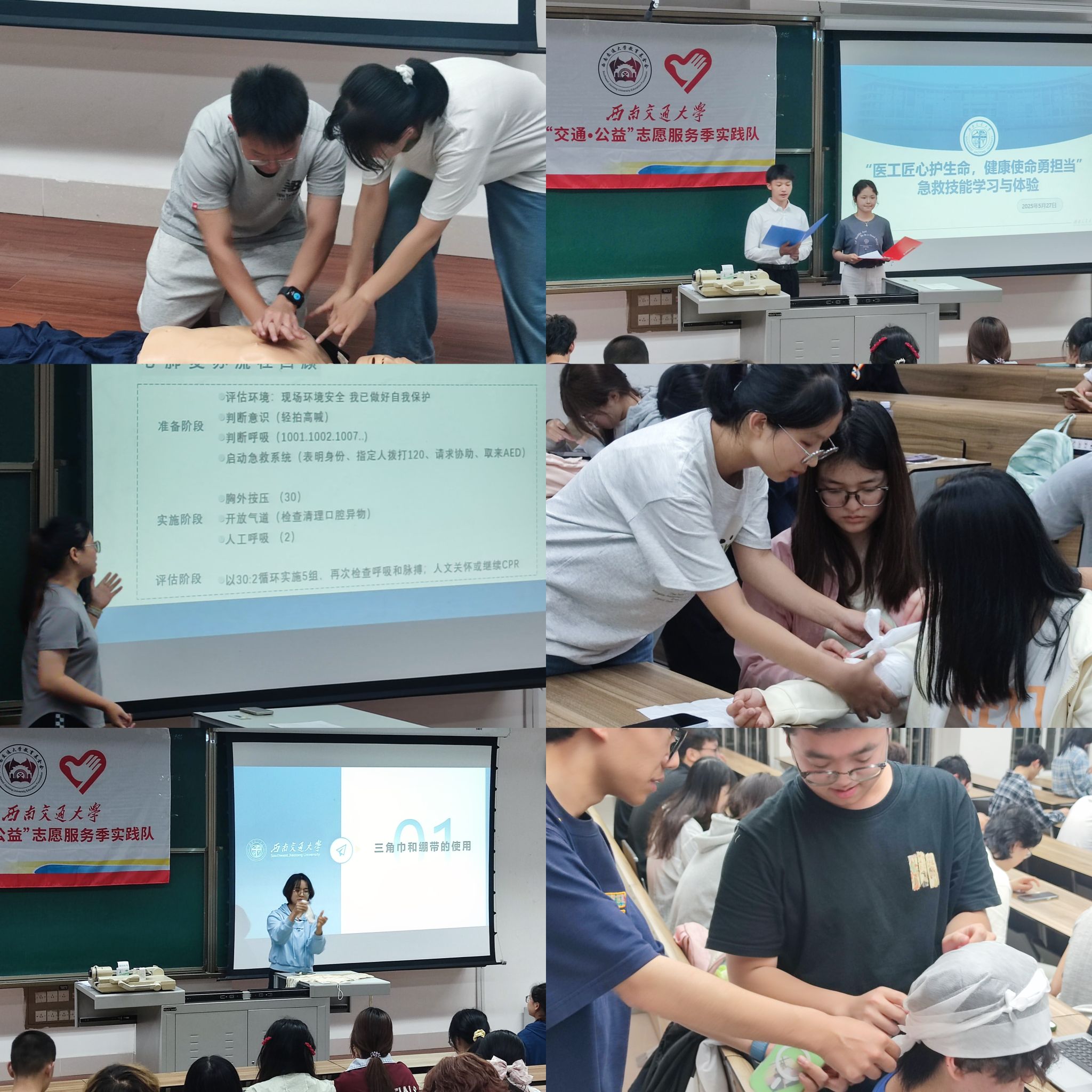 5月25 日上午10:30,由网投十大信誉可靠平台与建筑学院承办的第二期活动,在犀浦校区报告厅A100(八教一楼中庭)准时拉开帷幕。活动邀请到红十字会学生分会副会长邓宇为同学们进行急救知识与技能培训。培训内容涵盖心肺复苏、自动体外除颤器(AED)使用、创伤急救等核心技能,采用理论授课与模拟演练相结合的方式,让学员们在掌握理论知识的同时,能够在实践中提升操作能力。授课老师首先详细讲解了三角巾和绷带的多种使用方法,包括环形包扎、螺旋包扎、“8 字”包扎等,针对不同的创伤场景,深入浅出地介绍了每种包扎方法的适用情况和作用。随后,通过视频演示和现场示范,细致地展示了心肺复苏的整个流程,从判断现场环境安全到胸外按压、开放气道、人工呼吸等每一个步骤,都进行了详细的讲解,并强调了操作过程中的注意事项。在模拟演练环节,同学们积极参与,在专业指导下进行实际操作,亲身体验急救过程,加深了对急救技能的理解和掌握。