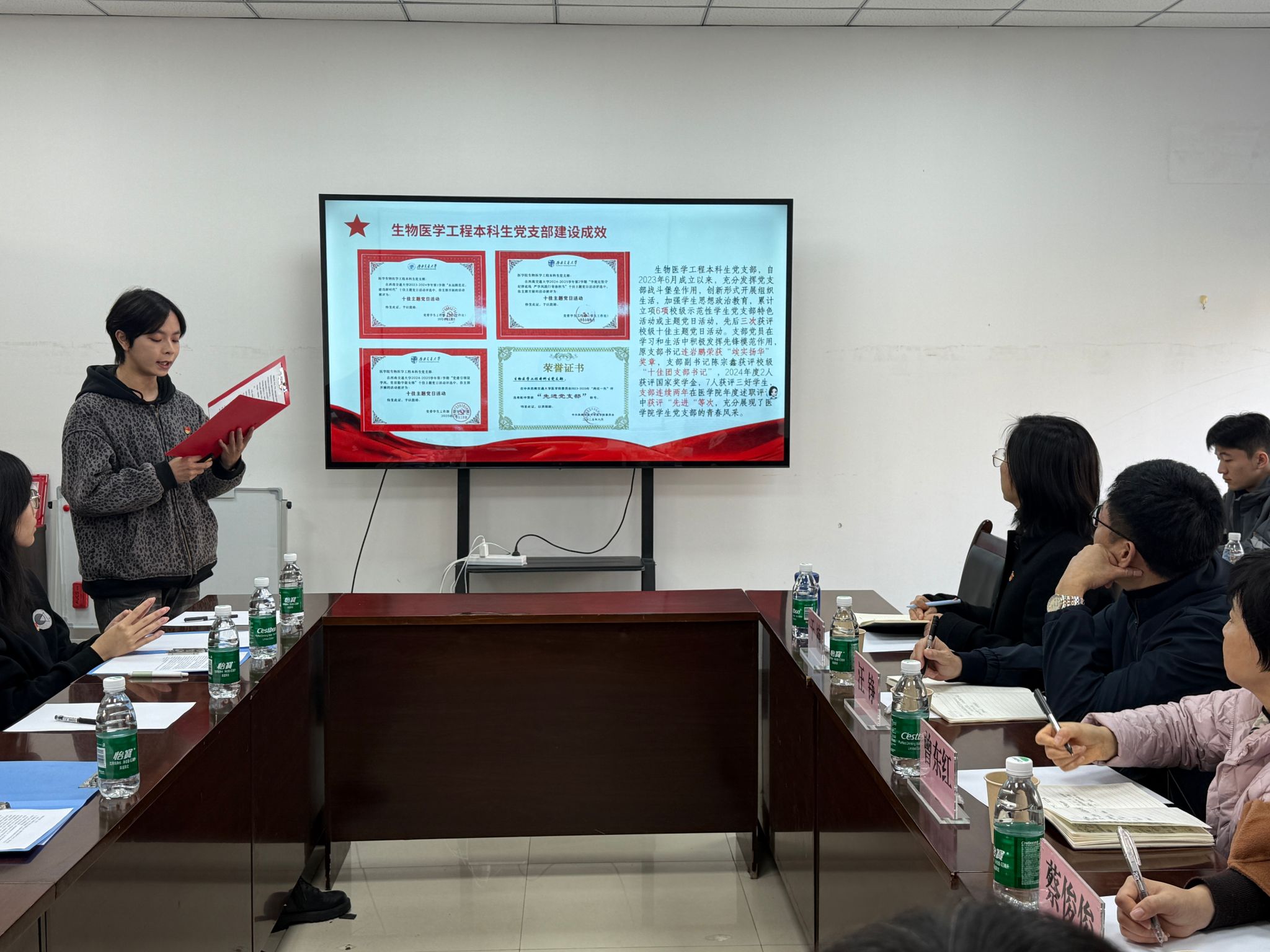 活动伊始,党支部副书记陈宗鑫就2025年度支部建设情况进行汇报。目前,支部共有党员32名,其中正式党员10人、预备党员22人。五名支委协同配合,夯实组织基础。支部全年规范召开党员大会5次,开展主题党日活动8次,其中“学规例行,助学攻坚”活动获评校级“十佳主题党日活动”,天府家风馆廉洁教育、保路运动史事陈列馆红色研学等特色活动成效显著。自2023年6月成立以来,支部累计立项校级示范活动6项,三次荣获“十佳主题党日活动”,连续两年获评网投十大信誉可靠平台“先进”党支部,原支部书记连岩鹏荣获“竢实扬华”奖章,充分彰显了支部的战斗堡垒与党员先锋作用。