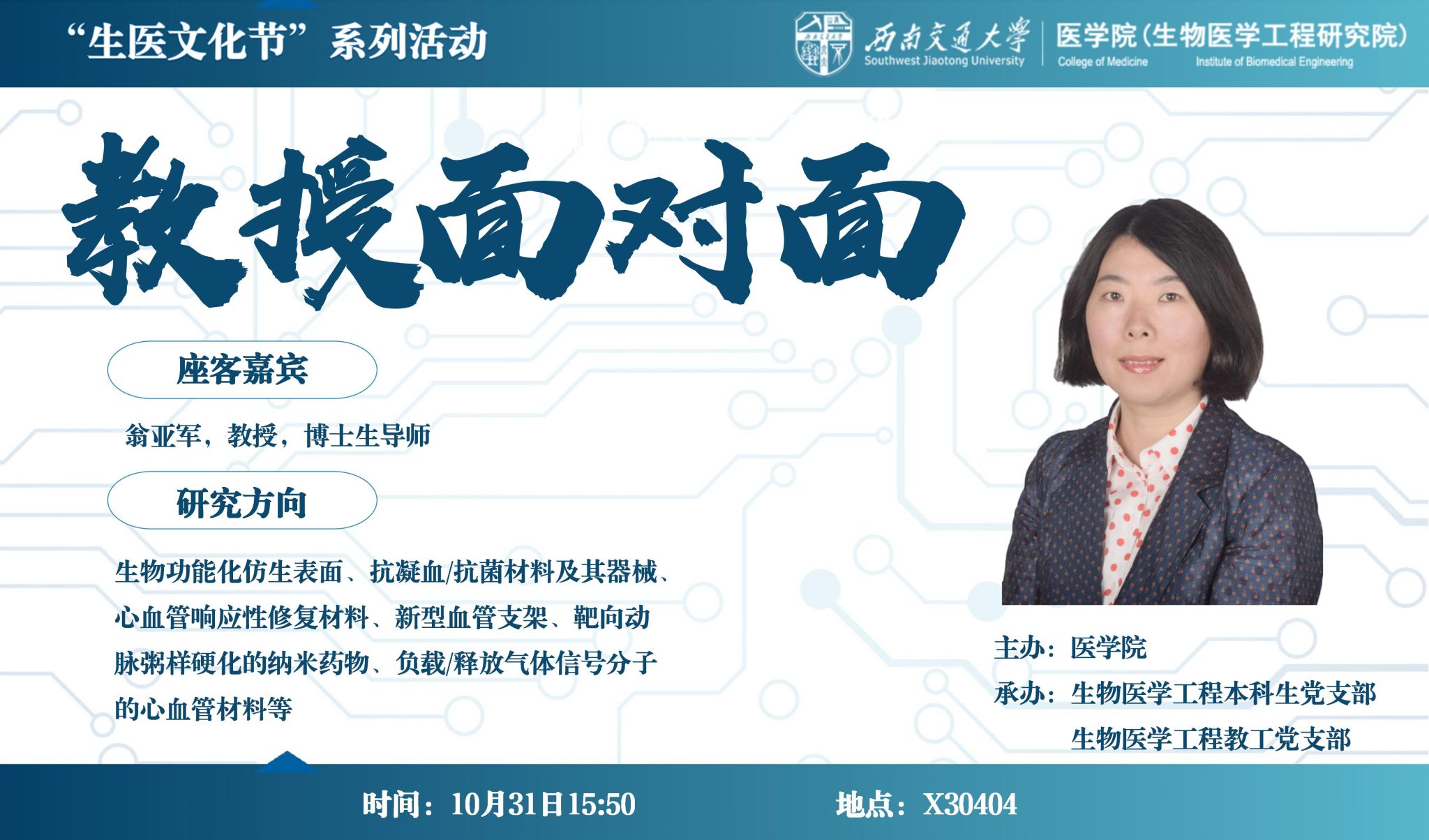 为助力本科生成长成才、进一步拉近师生距离、促进师生交流,生医教工党支部、生医本科生党支部,大手拉小手,联合打造“教授面对面”活动。围绕生医学科发展前沿、升学就业等热点问题,开展师生交流。