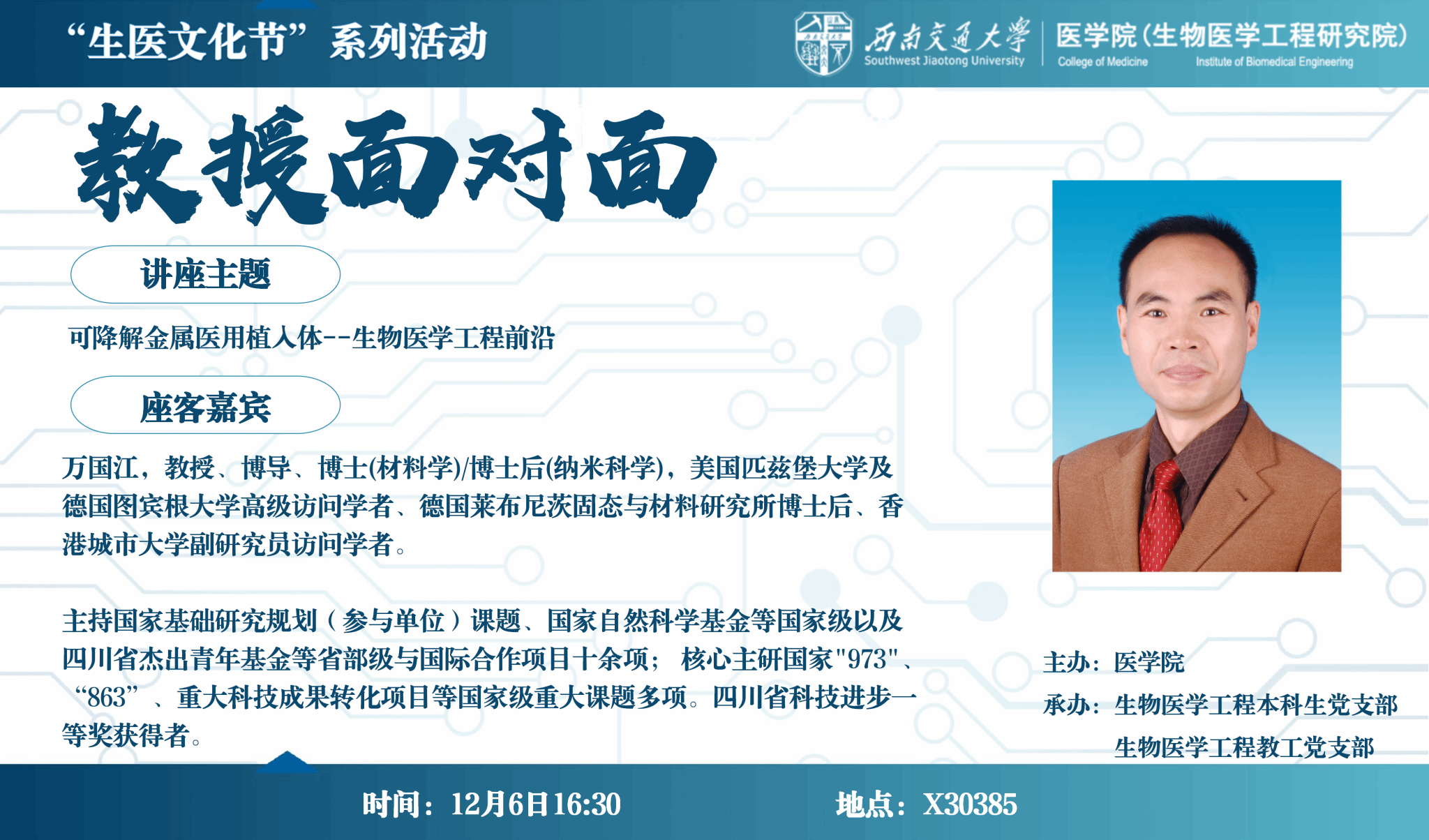 讲座主题:可降解金属医用植入体--生物医学工程前沿