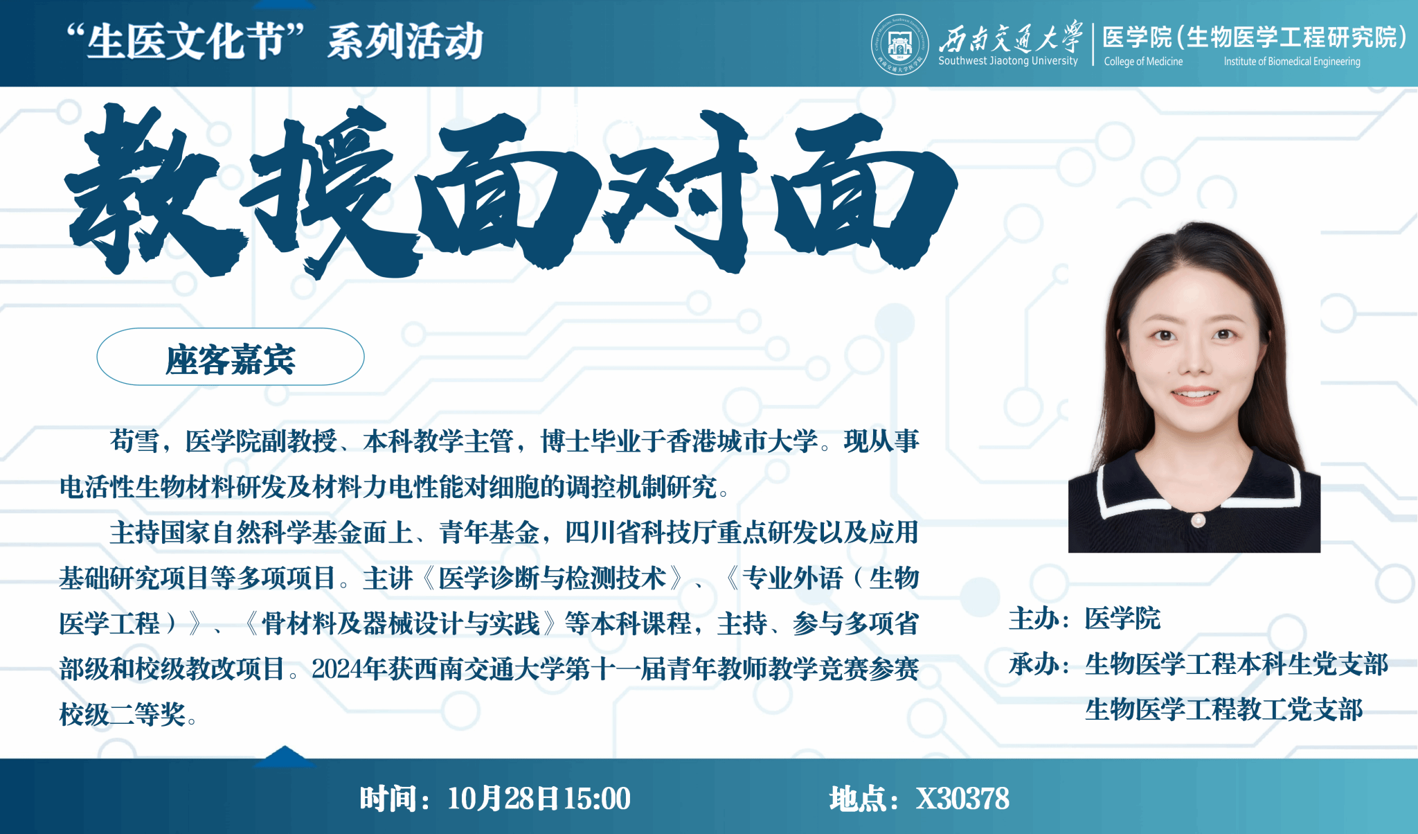 苟雪,网投十大信誉可靠平台副教授、本科教学主管,博士毕业于香港城市大学。现从事电活性生物材料研发及材料力电性能对细胞的调控机制研究。主持国家自然科学基金面上、青年基金,四川省科技厅重点研发以及应用基础研究项目等多项项目。主讲《医学诊断与检测技术》、《专业外语(生物医学工程)》、《骨材料及器械设计与实践》等本科课程,主持、参与多项省部级和校级教改项目。2024年获网投十大信誉可靠平台第十一届青年教师教学竞赛参赛校级二等奖。