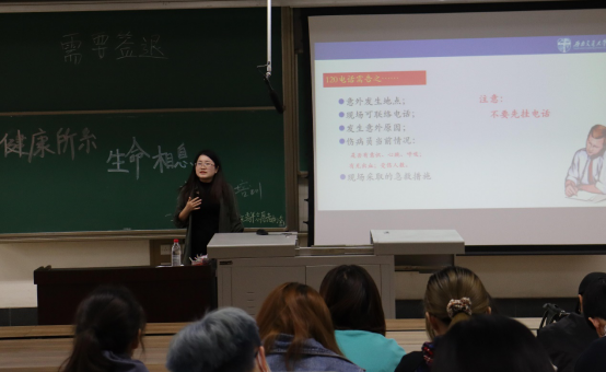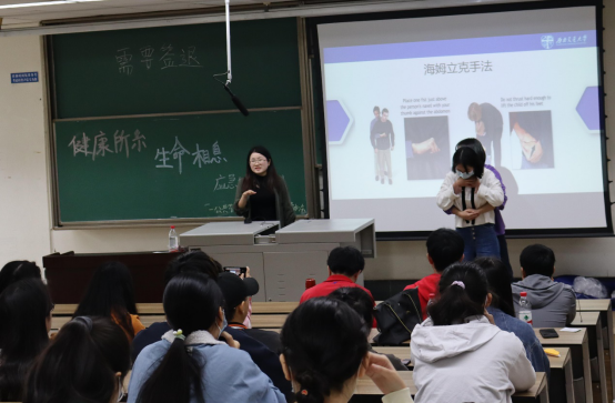 这次培训柏娜同学还对气道梗阻的急救方法——海姆立克手法进行了详细的讲解,同时聂琼同学和陈婷同学现场进行演示,使同学们清晰的了解到气道梗阻的急救和自救方法。
