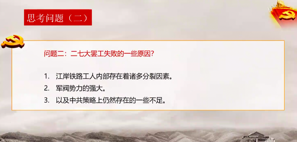 本次读书会的主题是大革命时期的历史,在内容上分为北伐前准备,北伐战争和大革命的转折三大板块。王昕昱同志作为研二党小组的代表,进行了PPT分享:1924年至1927年,中国大地上爆发了轰轰烈烈的反对帝国主义、反对封建军阀的革命运动。大革命运动席卷全国,规模之大,发动群众之广,影响之深远,在中国近代革命历史上是前所未有的。在学习中国共产党历史的过程中,研二党小组成员展开了进一步的思考与讨论:对中国共产党在大革命中扮演怎样的角色?二七大罢工失败的原因是什么?工农斗争对北伐战争取得胜利有哪些促进作用?等一系列问题进行了交流,并分享了各自的看法。