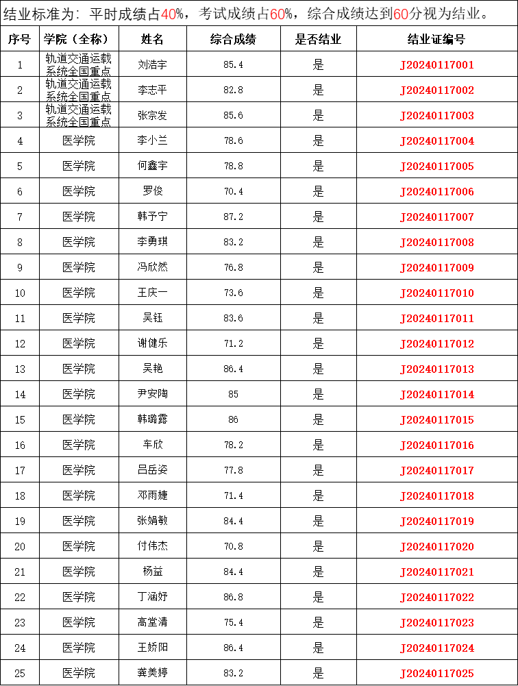 结业标准:平时成绩占40%,考试成绩占60%,综合成绩达到60分视为结业