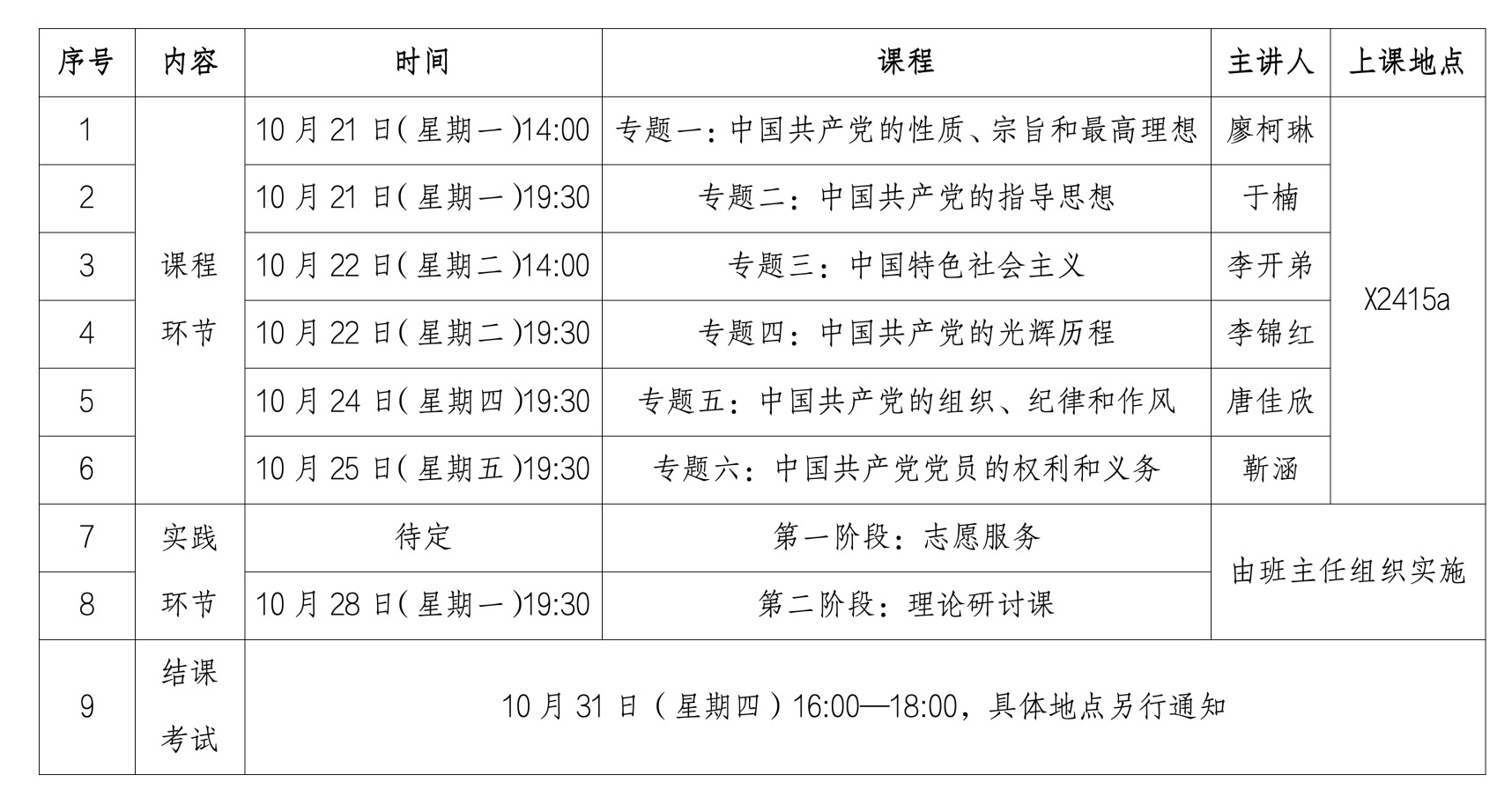 1、培训实行课堂教学、实践教学和自主学习相结合的培养方式。课堂教学由分党校聘请党课教师主讲,实践教学由各班主任组织、分小组进行,自学学习可与学生时事政策教育、党团活动等环节相结合。