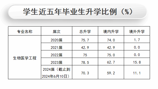 六、相关数据:网投十大信誉可靠平台生物医学工程现有学生200多人,近十年本科生升学率和就业势头良好,保研率18.5%以上、学生连续三年升学率70%以上。