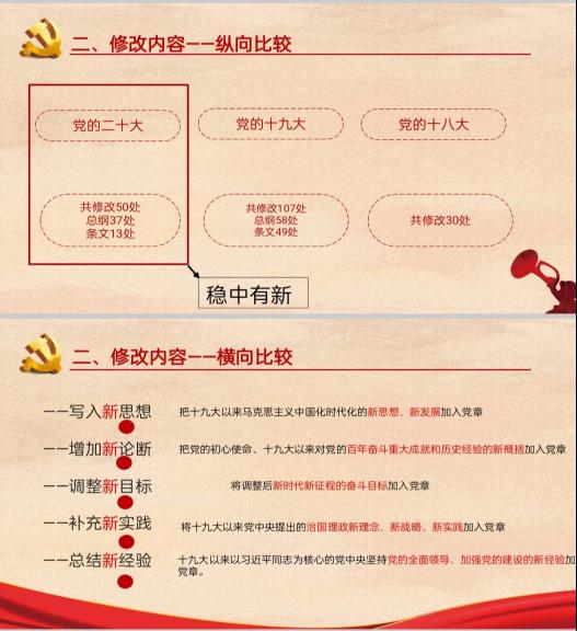 通过对党章修改内容进行纵向和横向比较,同志们更加直观地领悟了党章中的新表述、新概括及新目标;通过对中国共产党百年历史经验总结的学习,同志们更加深刻地认识到了中国共产党治国理政新理念、管党治党新做法。