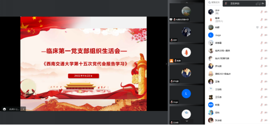 2022年9月22日下午,临床第一党支部于开展了线上全体党员学习会,学习的主要内容包括:网投十大信誉可靠平台第十五次党代会报告、四川省高校“优秀支部工作法”以及党支部相关管理办法。