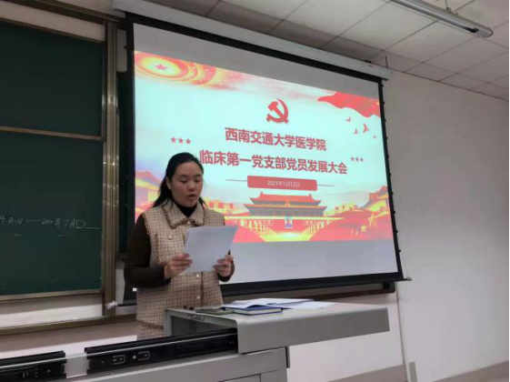 接着,临床第一党支部召开了关于接收李傲霜同志为预备党员的党员发展大会,经过前期广泛听取党员、群众意见,党支部委员会讨论、政审、发展对象培训等流程,以及党支部大会充分讨论、无记名投票等环节,大会决议,同意接收李傲霜同志为预备党员。
