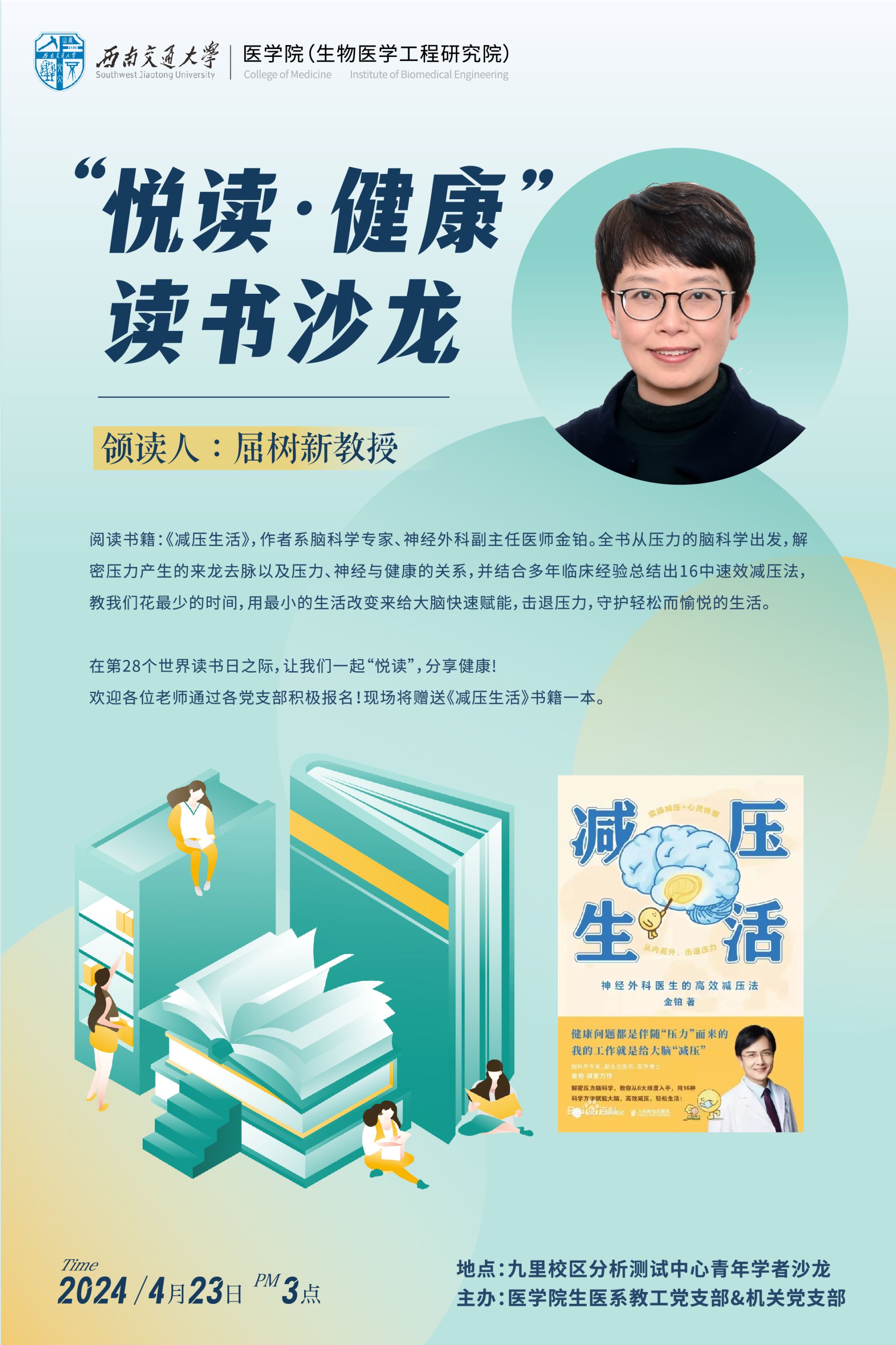 第28个“世界读书日”来临之际,为了帮助老师们掌握保持身心健康的科学方法,将由学院生医系党支部和机关党支部联合举办“悦读•健康”读书沙龙活动。